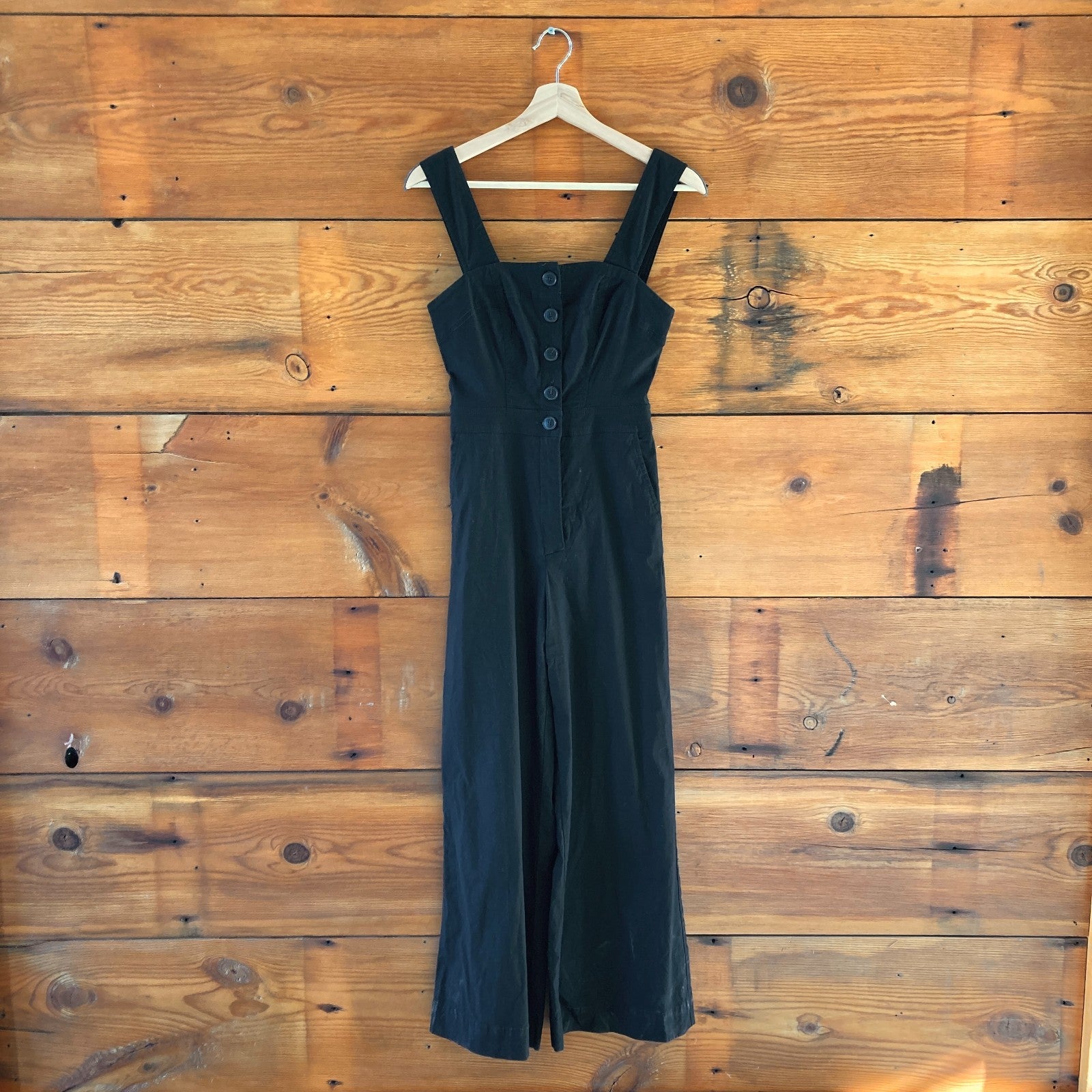 - Classic black Maeve Portside Colette jumpsuit from Anthropologie — a versatile and flattering wide-leg silhouette with button-front closure, adjustable straps, and front pockets.