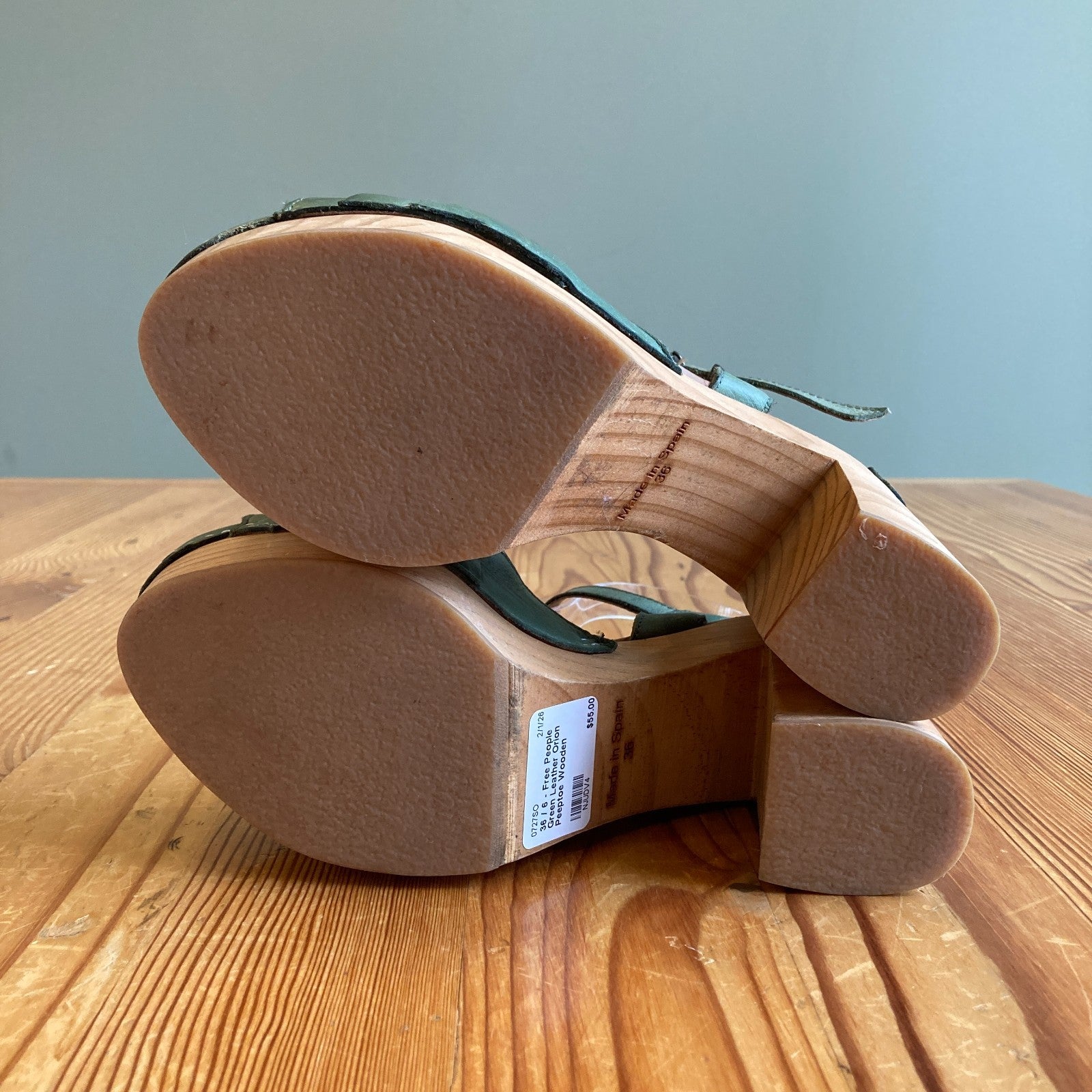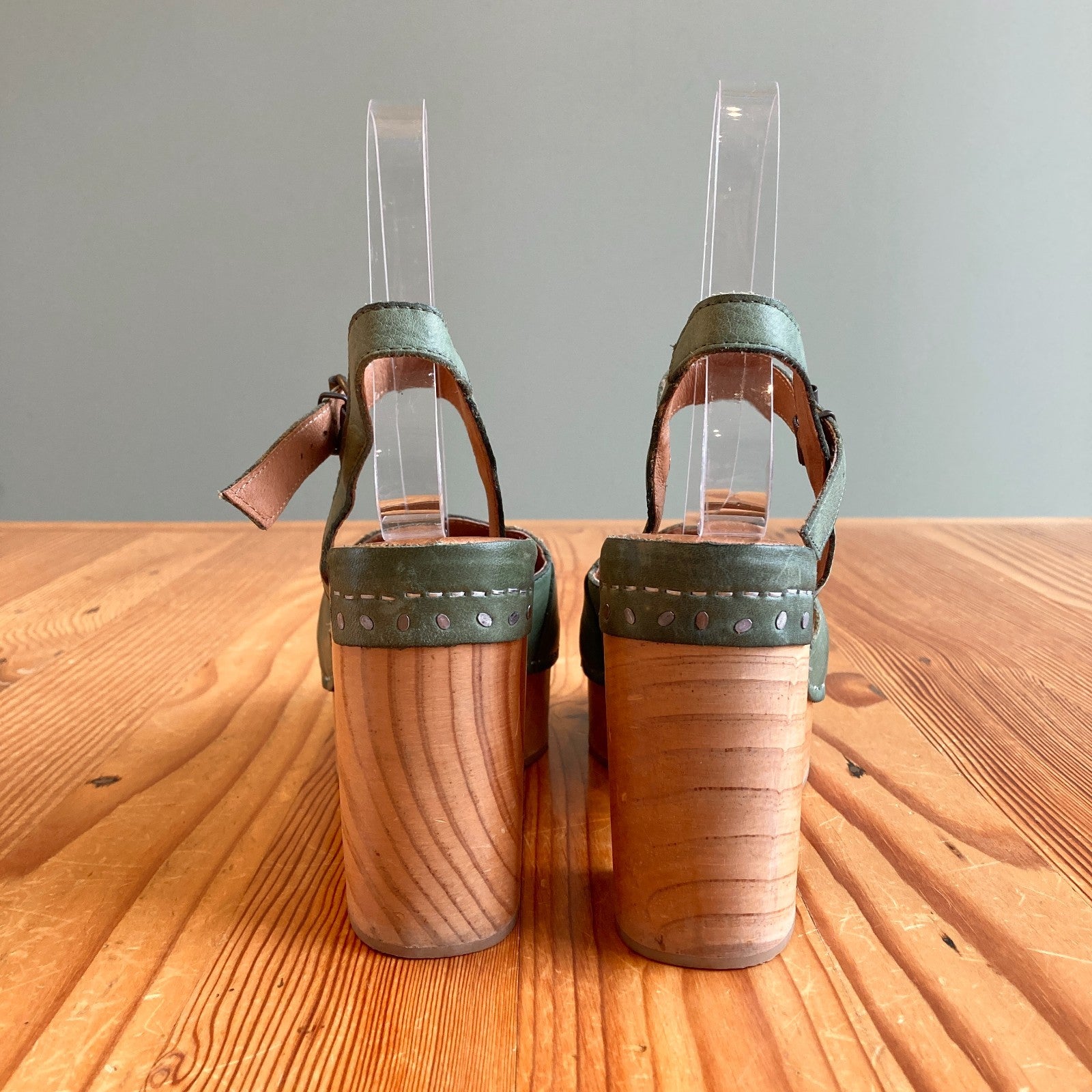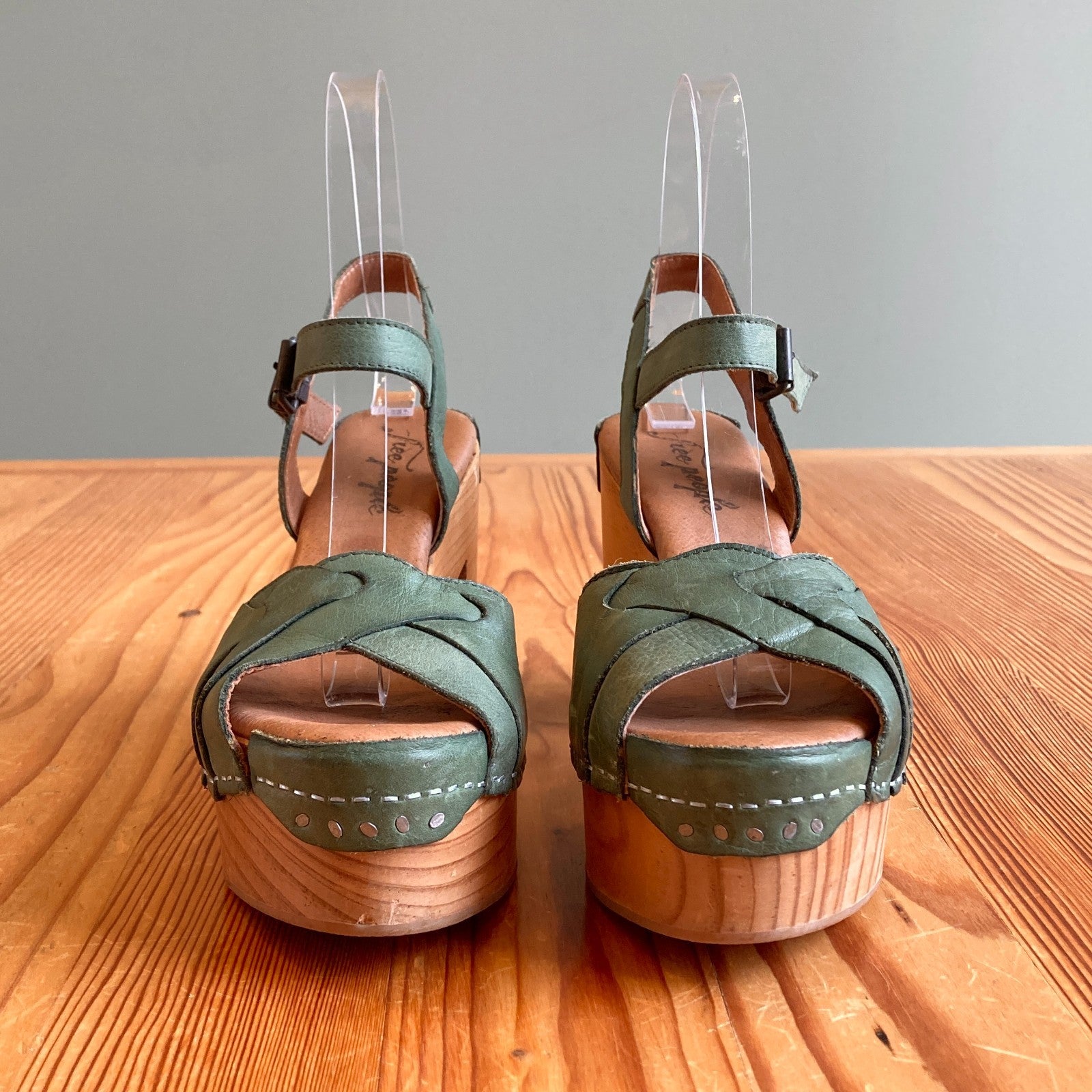 36 / 6 - Free People Green Leather Orion Peeptoe Wooden Platform Clogs 0727SO