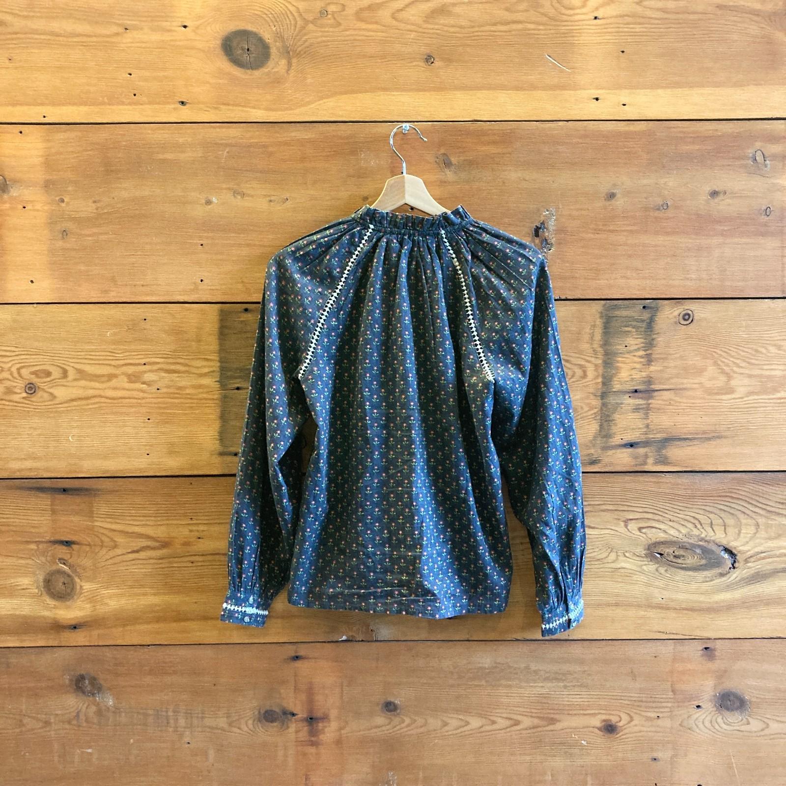 36 / S - Sezane Beatriz Navy Floral Long Sleeve Ruffled Neck Blouse Top 0208KS
