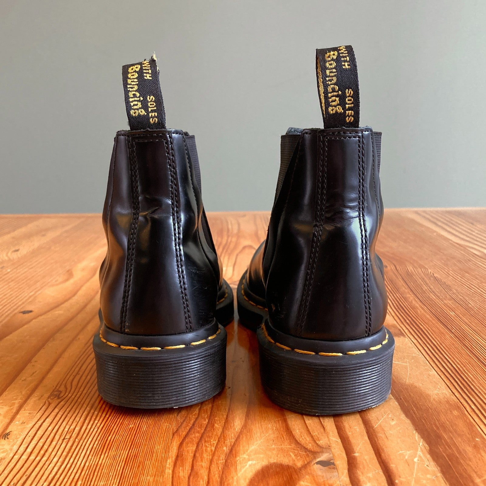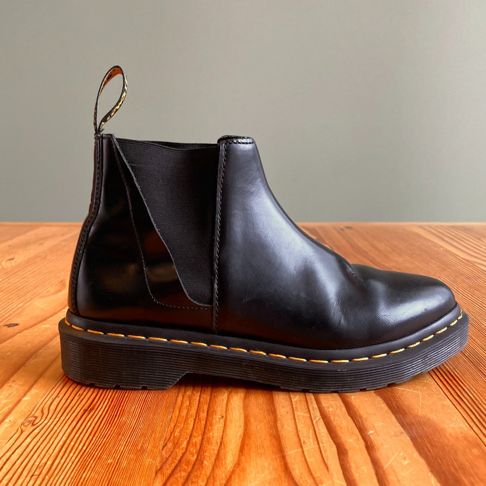 - Polished Smooth leather gives the boot a classic, premium feel, the front panel cleanly wraps around the toe from the throat, and side elasticated panelling offers ease of entry. Maintaining the classic Dr. Martens trademarks, Bianca includes yellow Z-welt stitching, iconic tread pattern and heel loop. The bouncy Airwair sole is oil-and-fat-resistant, hard wearing and offers good abrasion and slip resistance.