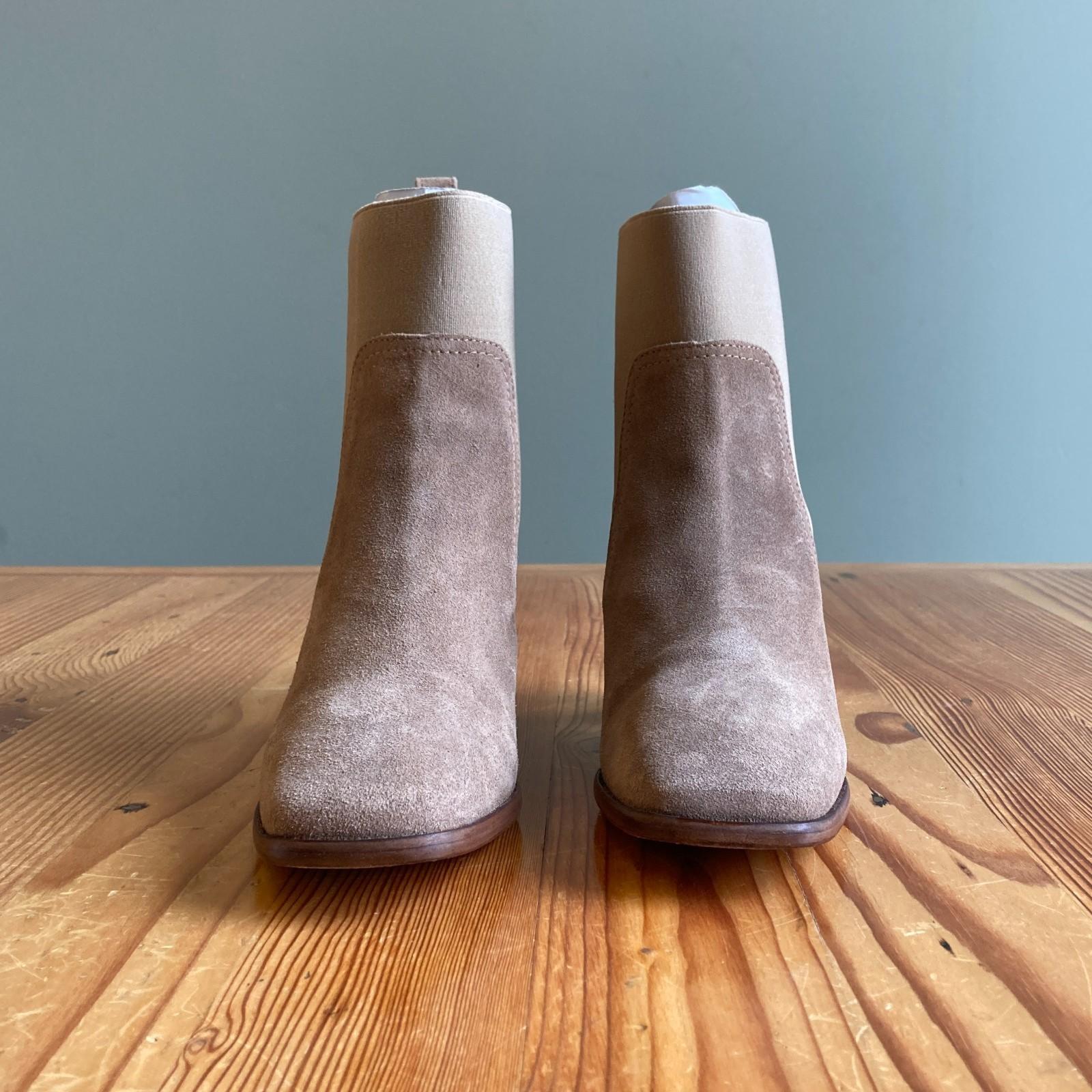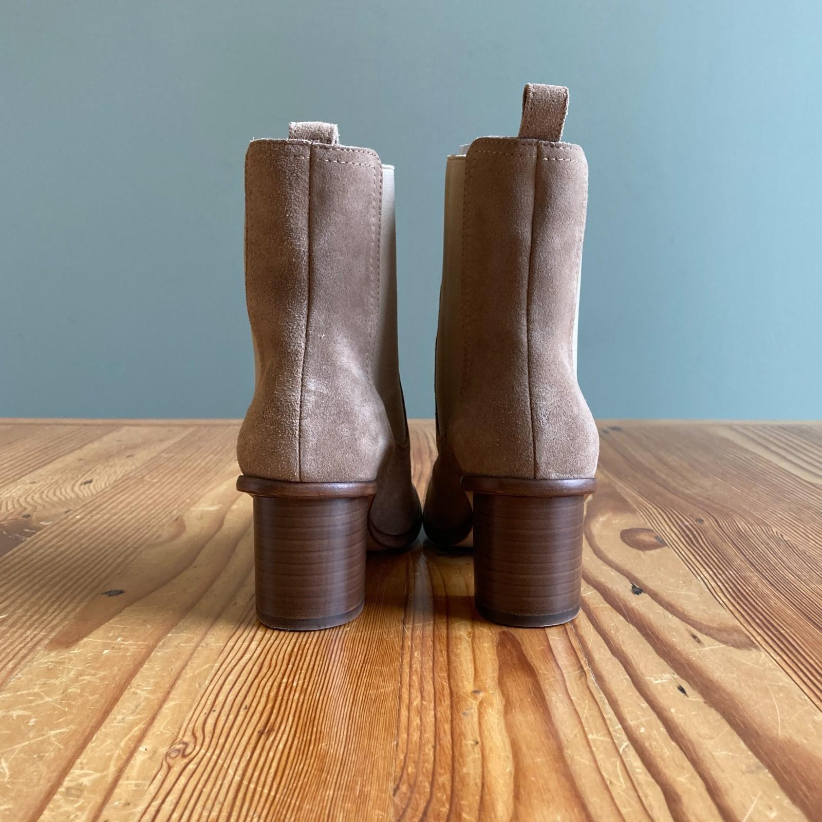 37 / 7 - Patina Taupe Suede Vero Square Toe Stacked Heel Boots NEW w/ Box 0206RN