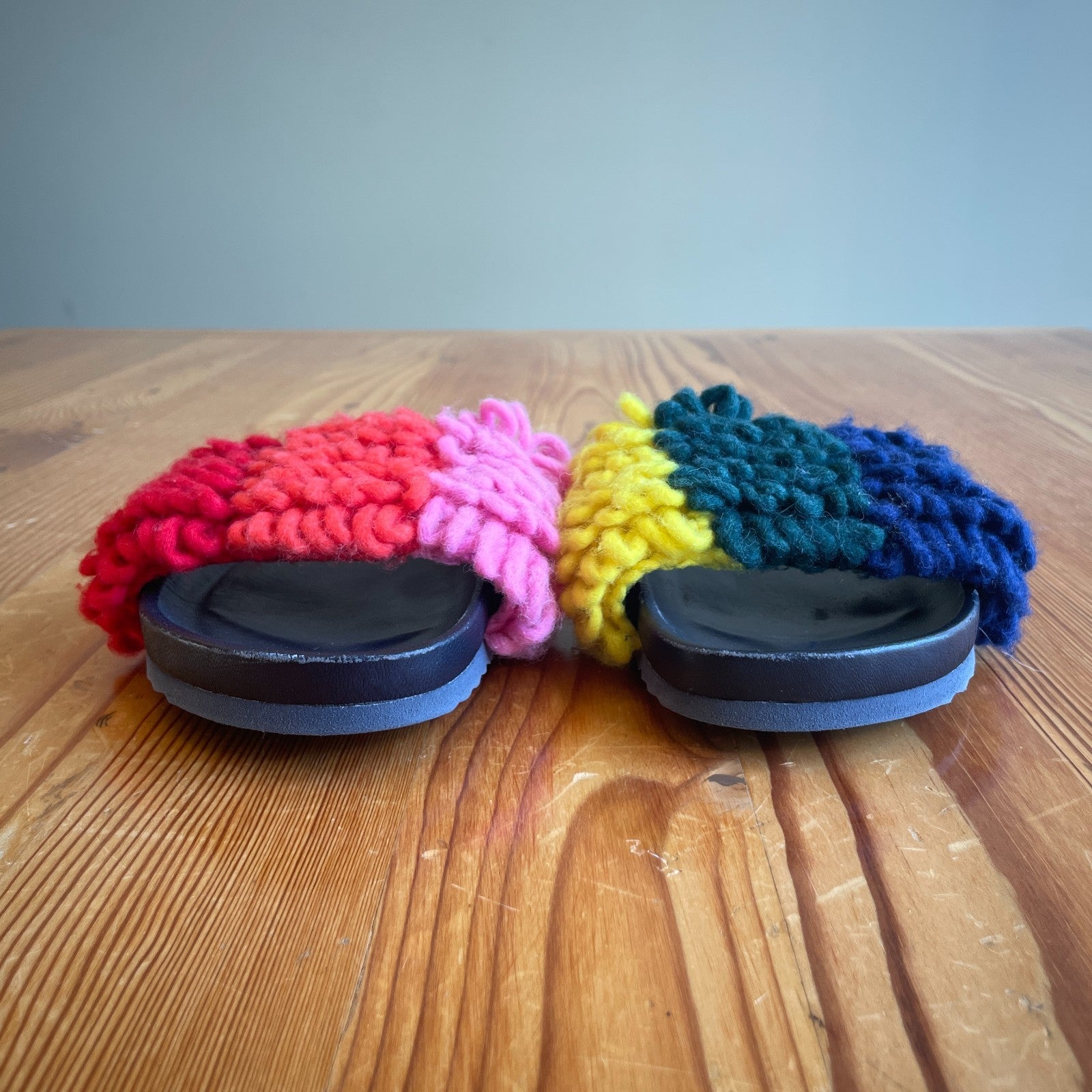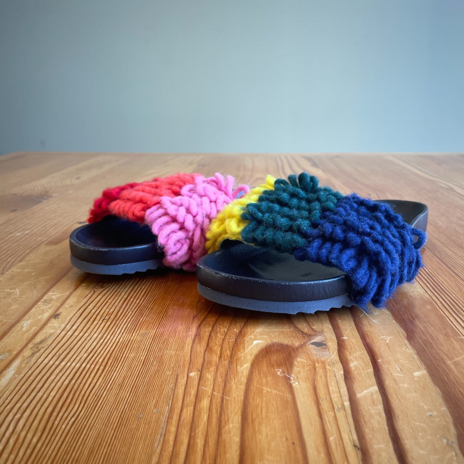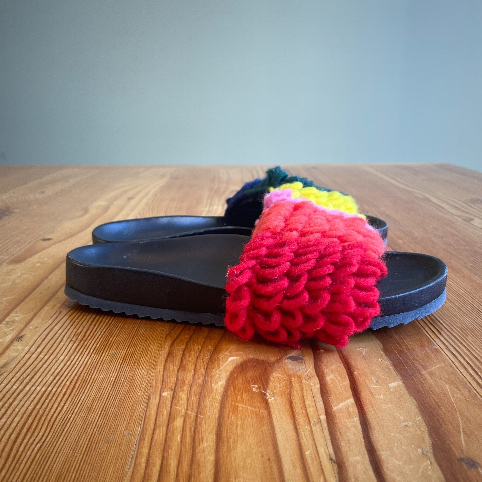 - Multicolor flat sandals with a loop knit texture on top of slide