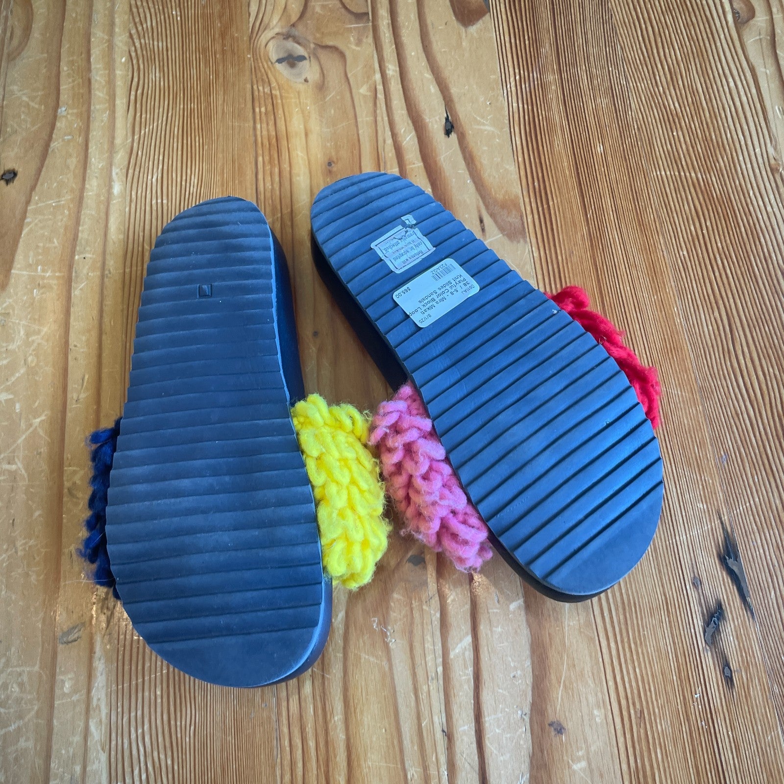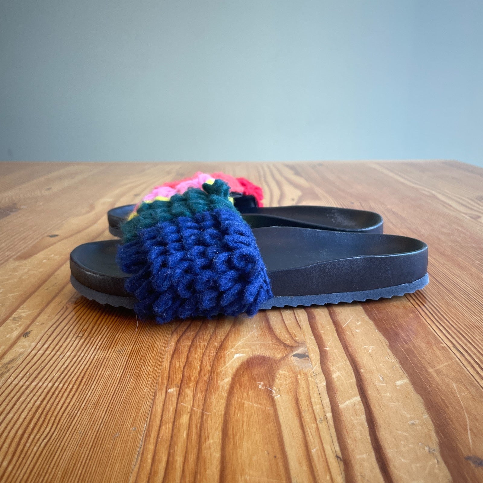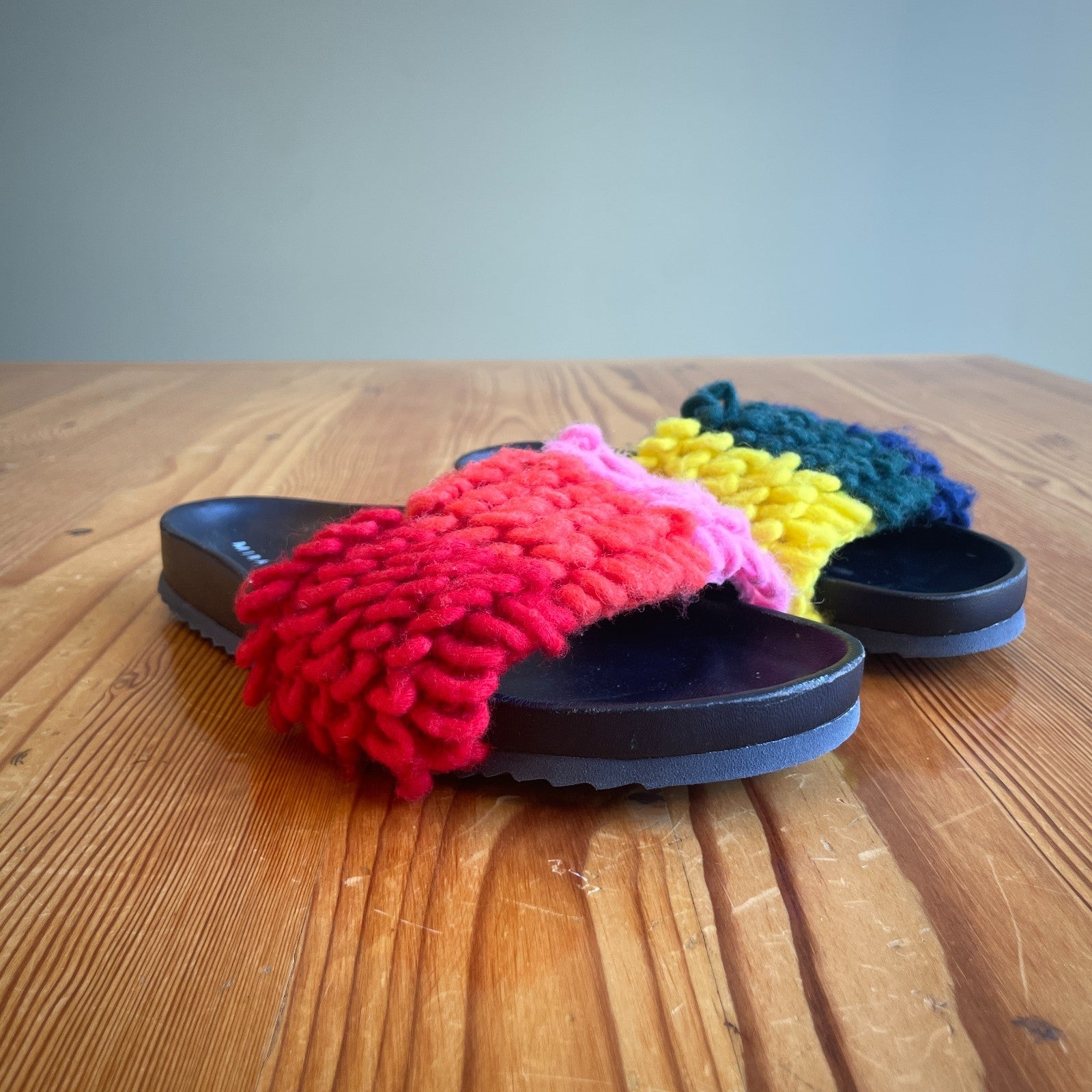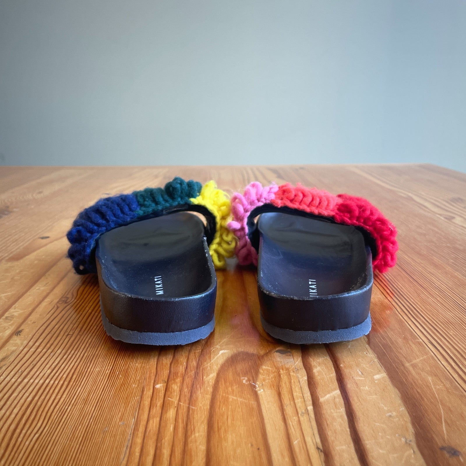 - Multicolor flat sandals with a loop knit texture on top of slide