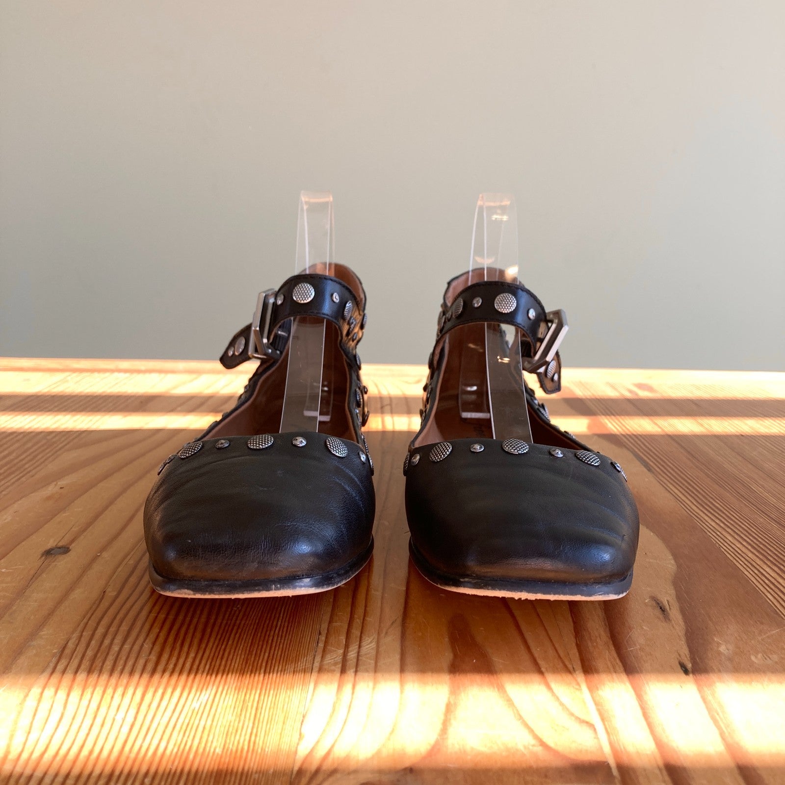 - These flats feature an adjustable Mary Jane strap and cushioned footbed for comfort, blending edgy details with a versatile everyday silhouette.