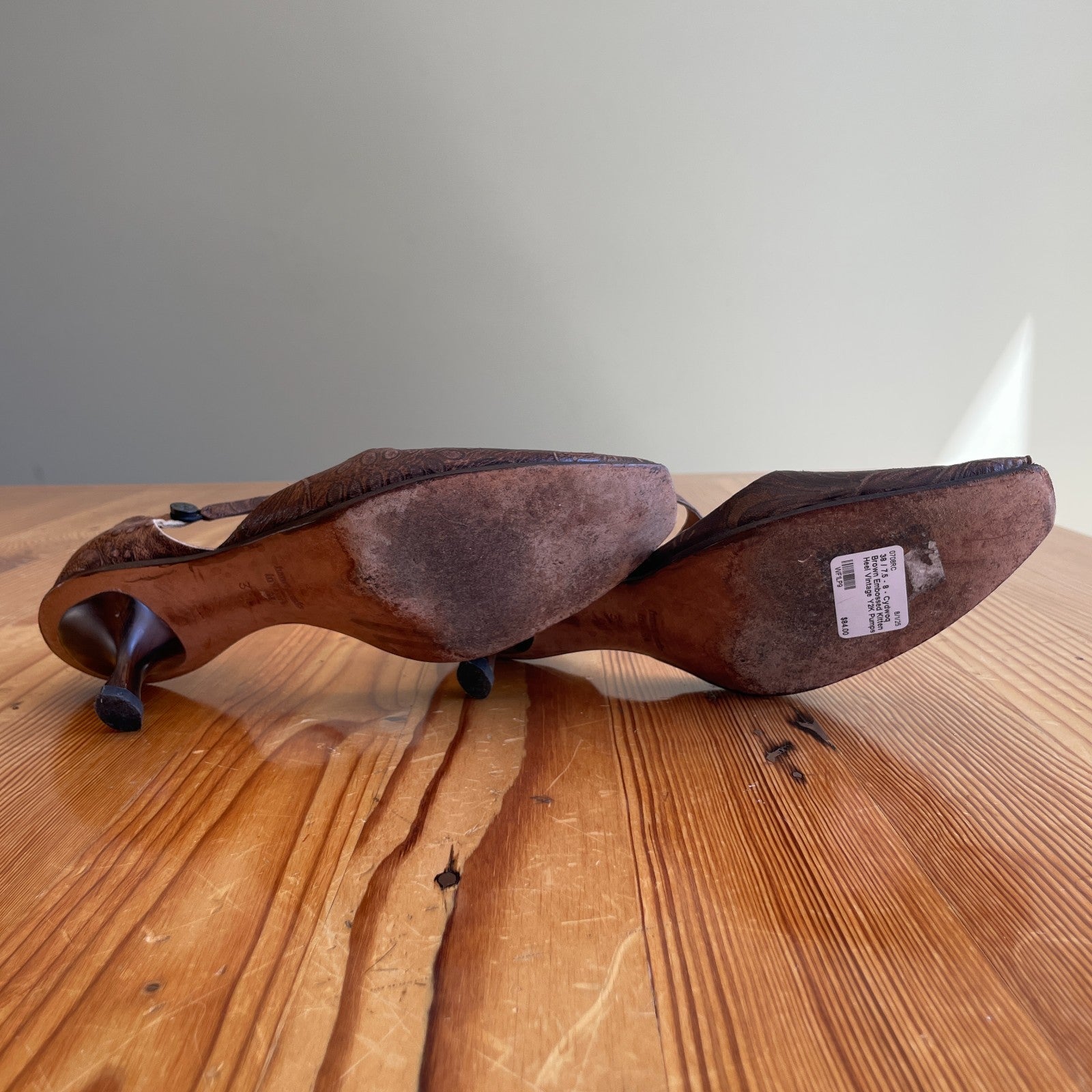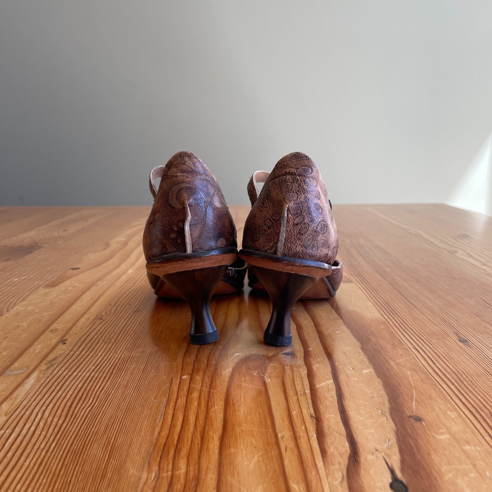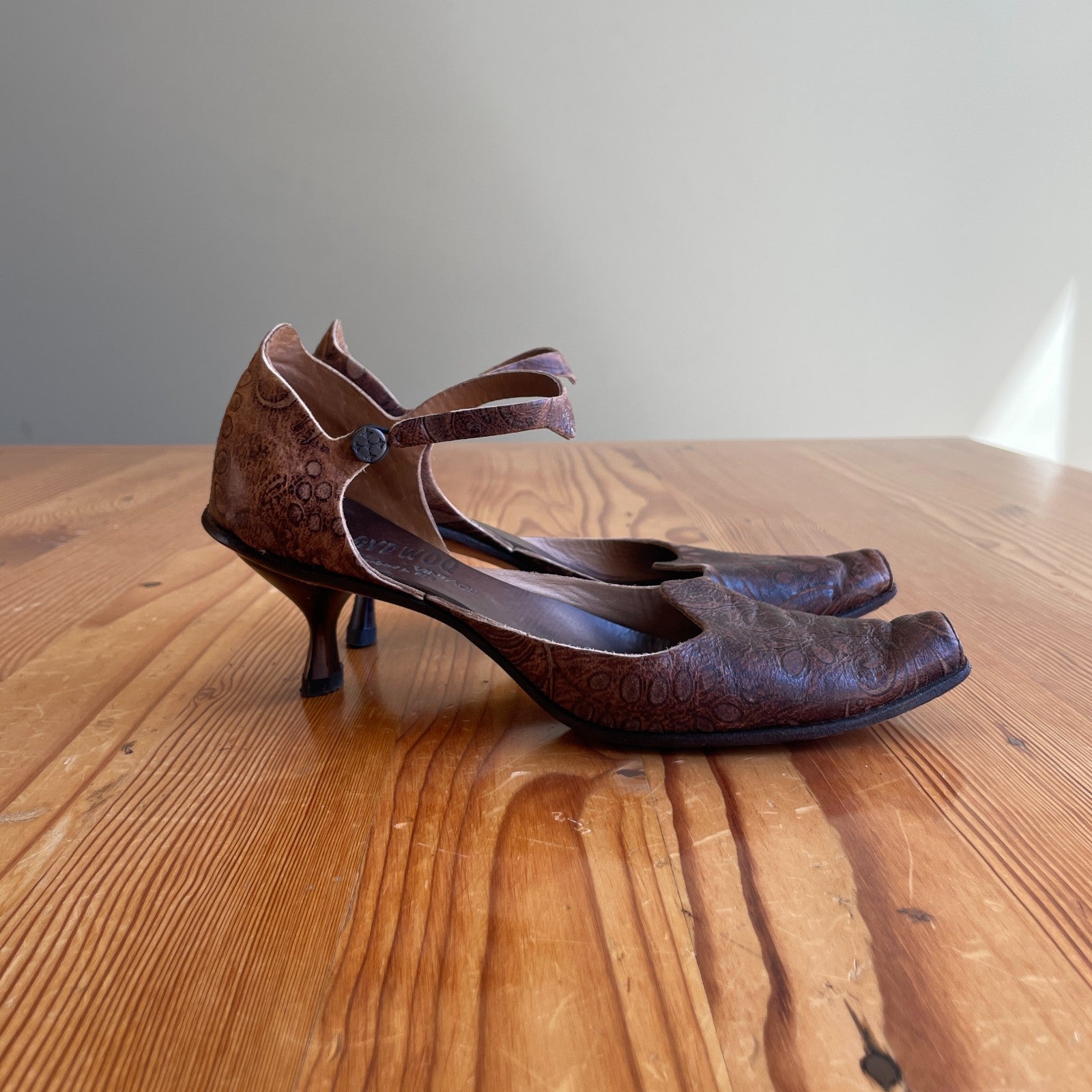 38 / 7.5 - 8 - Cydwoq Brown Embossed Kitten Heel Vintage Y2K Pumps 0708RC