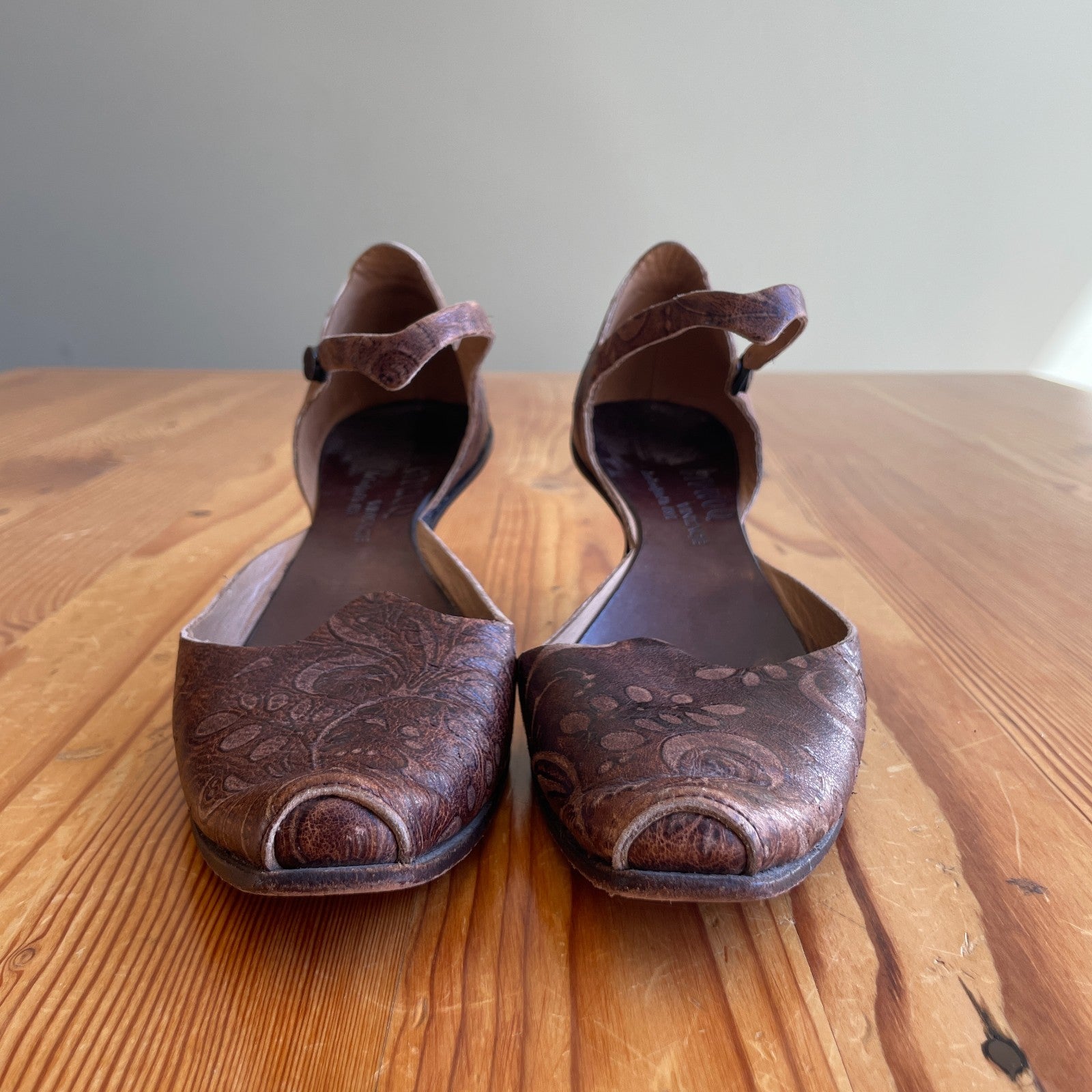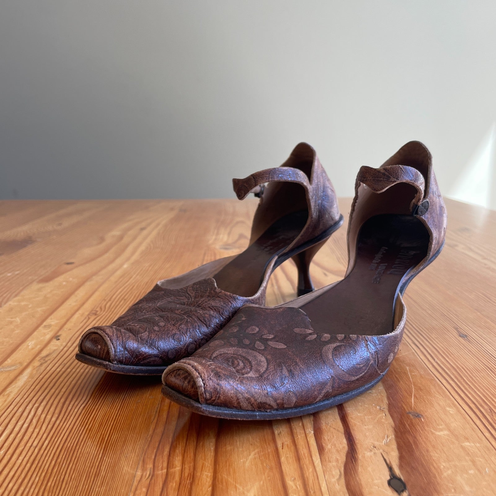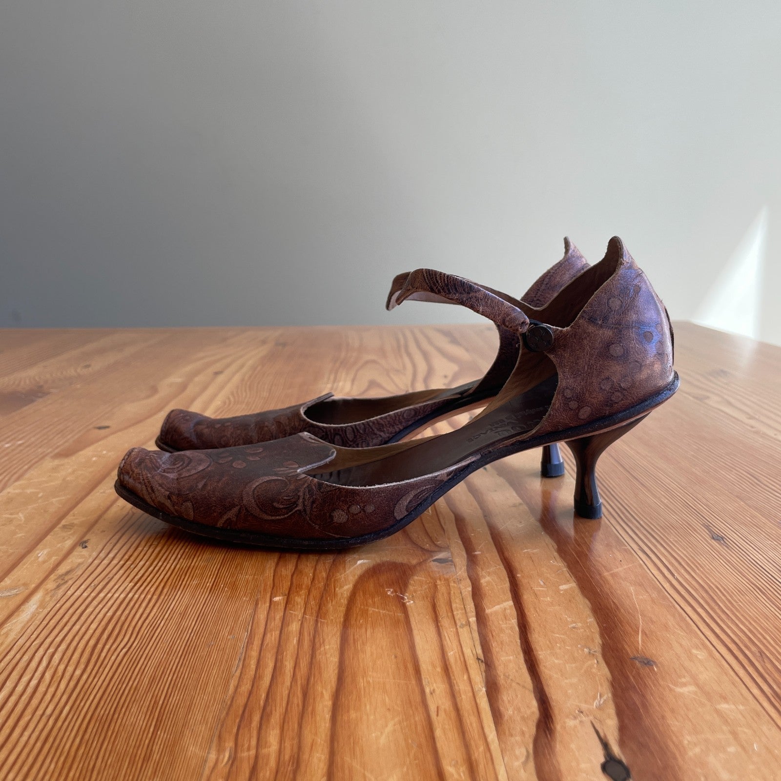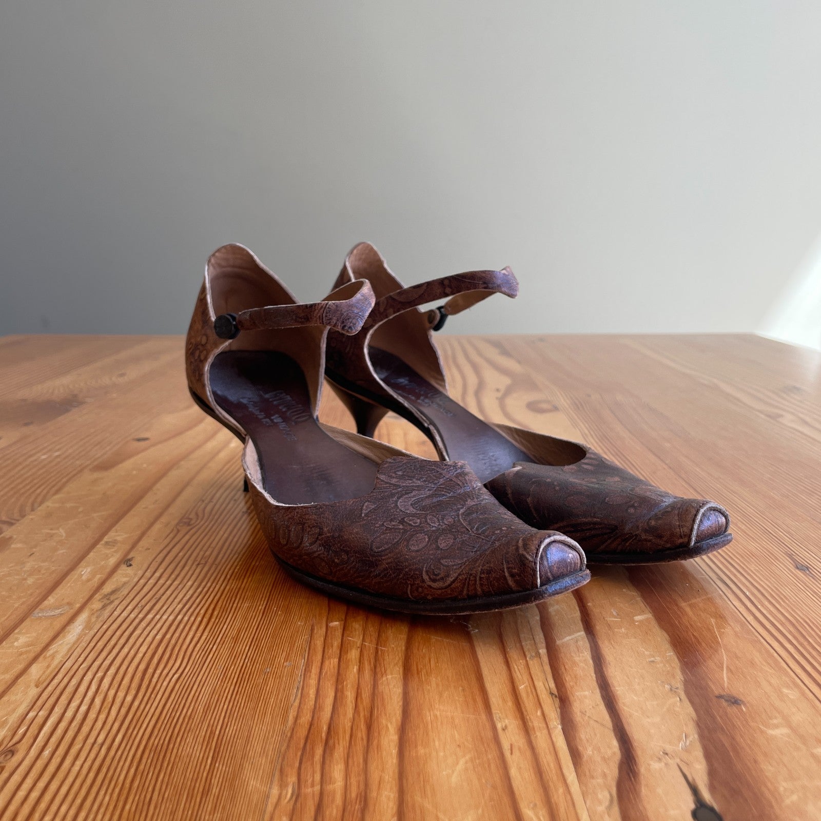 38 / 7.5 - 8 - Cydwoq Brown Embossed Kitten Heel Vintage Y2K Pumps 0708RC