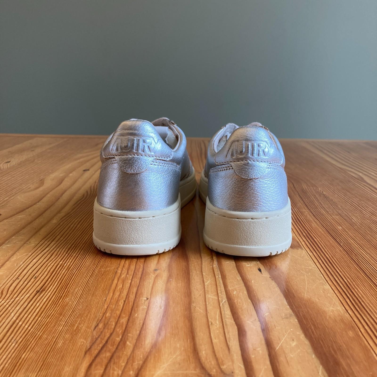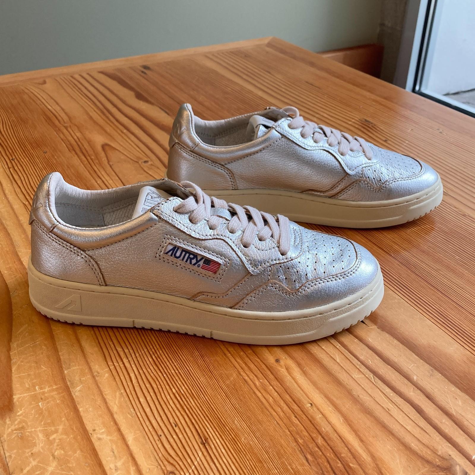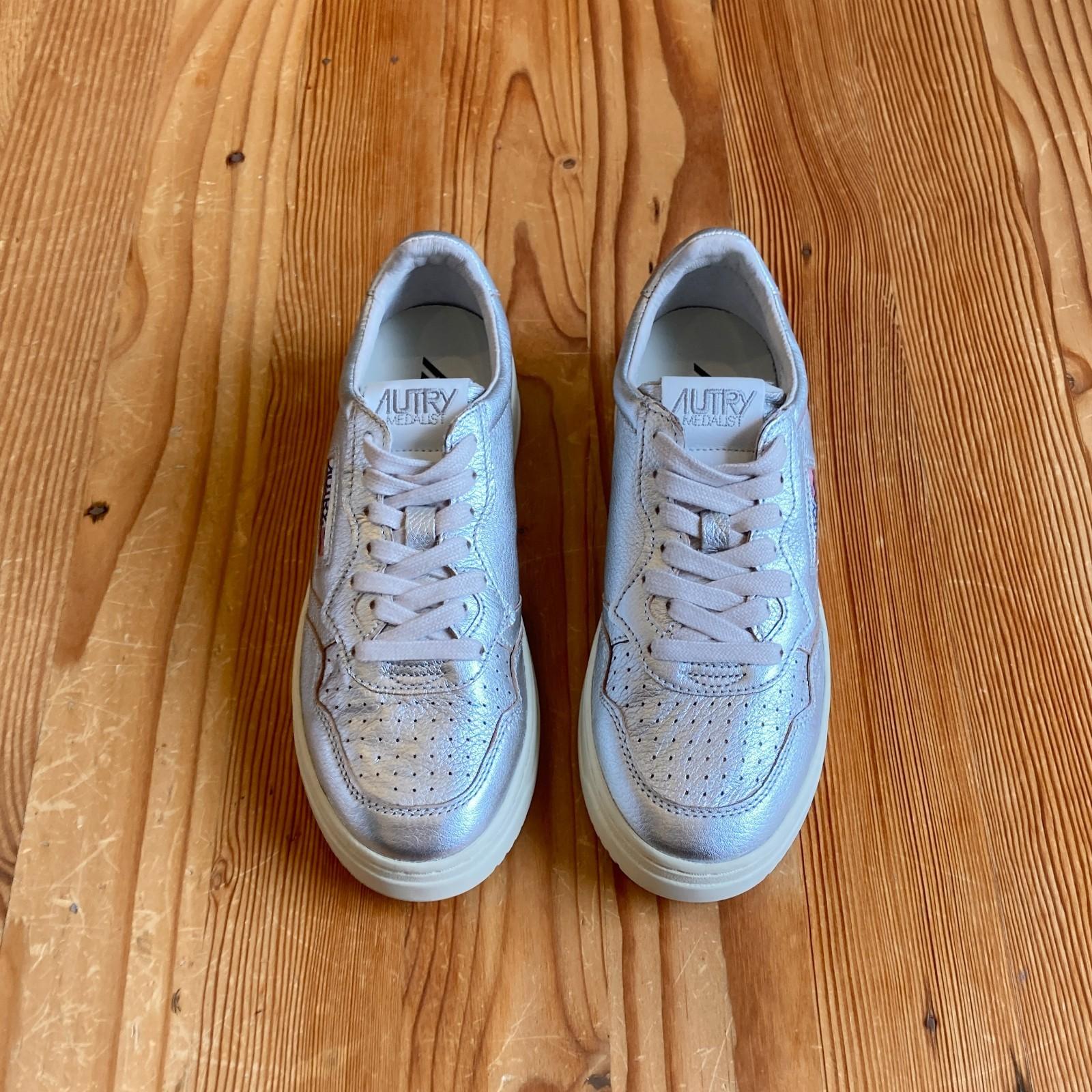 - Autry reinterprets its 'Medalist' sneakers from the 1980s in shiny silver leather. Accented with the label's flag logo, this 'Low' pair has bouncy rubber soles and soft terry linings.