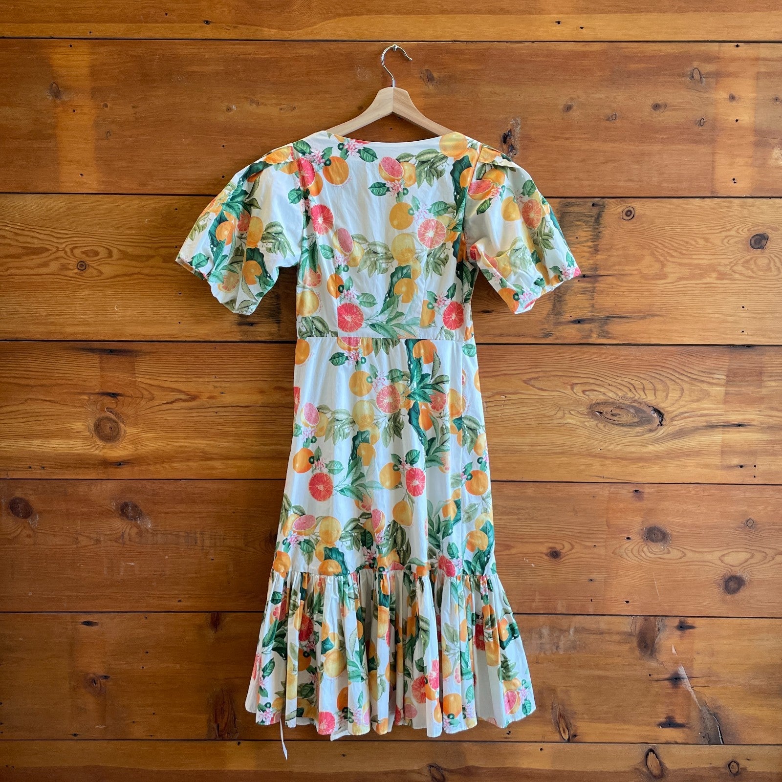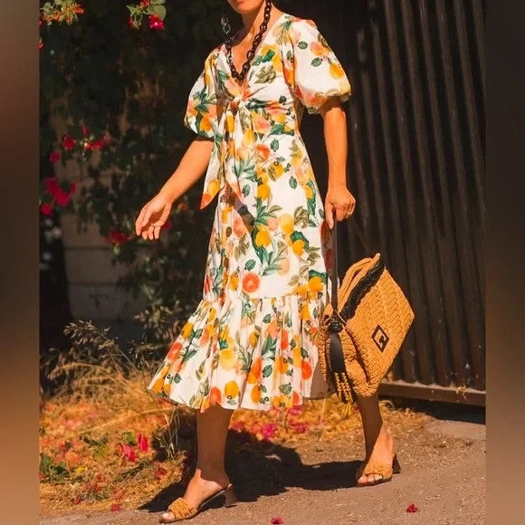 - Cara Cara Georgica Puff-Sleeve Tie Front Grapefruit Citrus Print A-Line Midi Dress