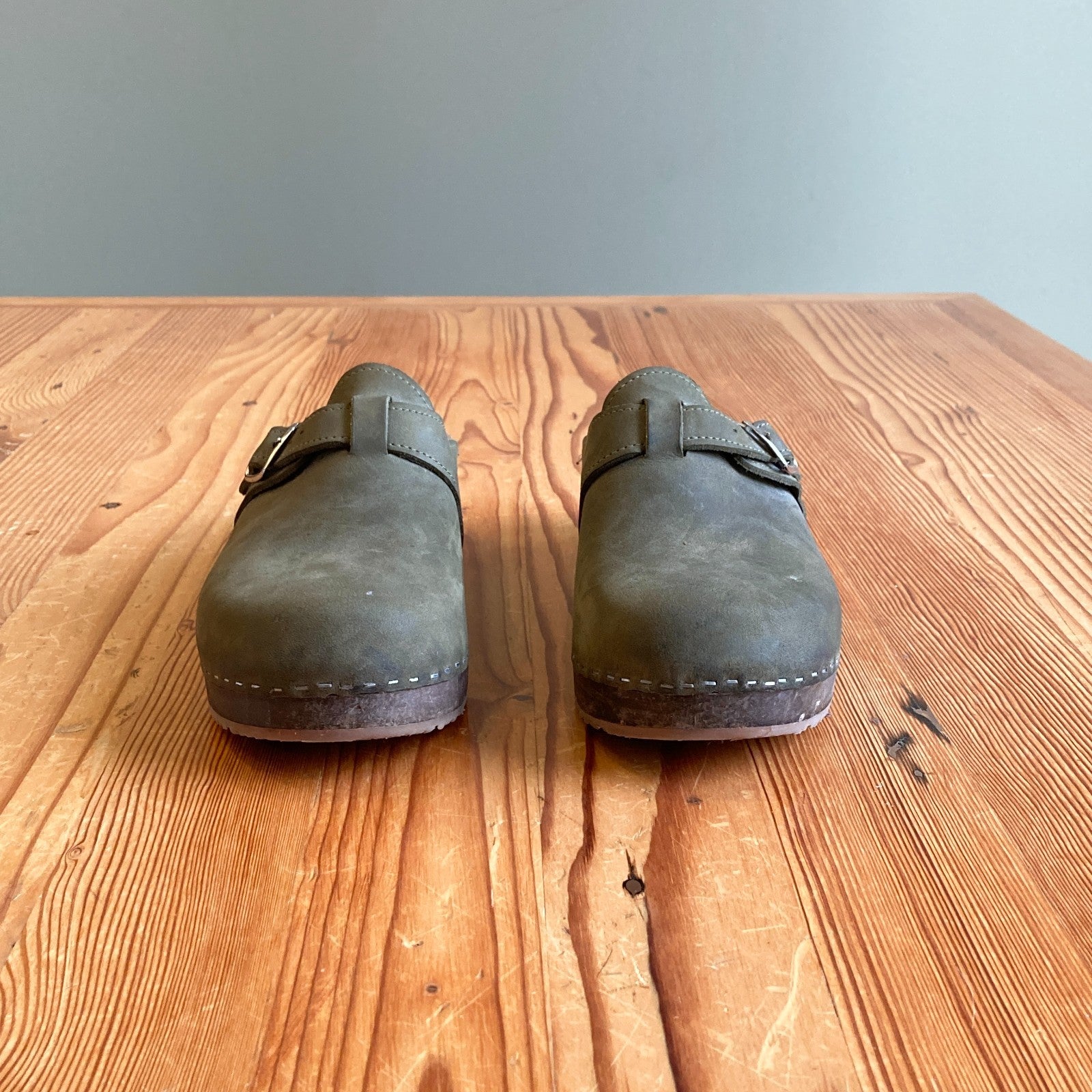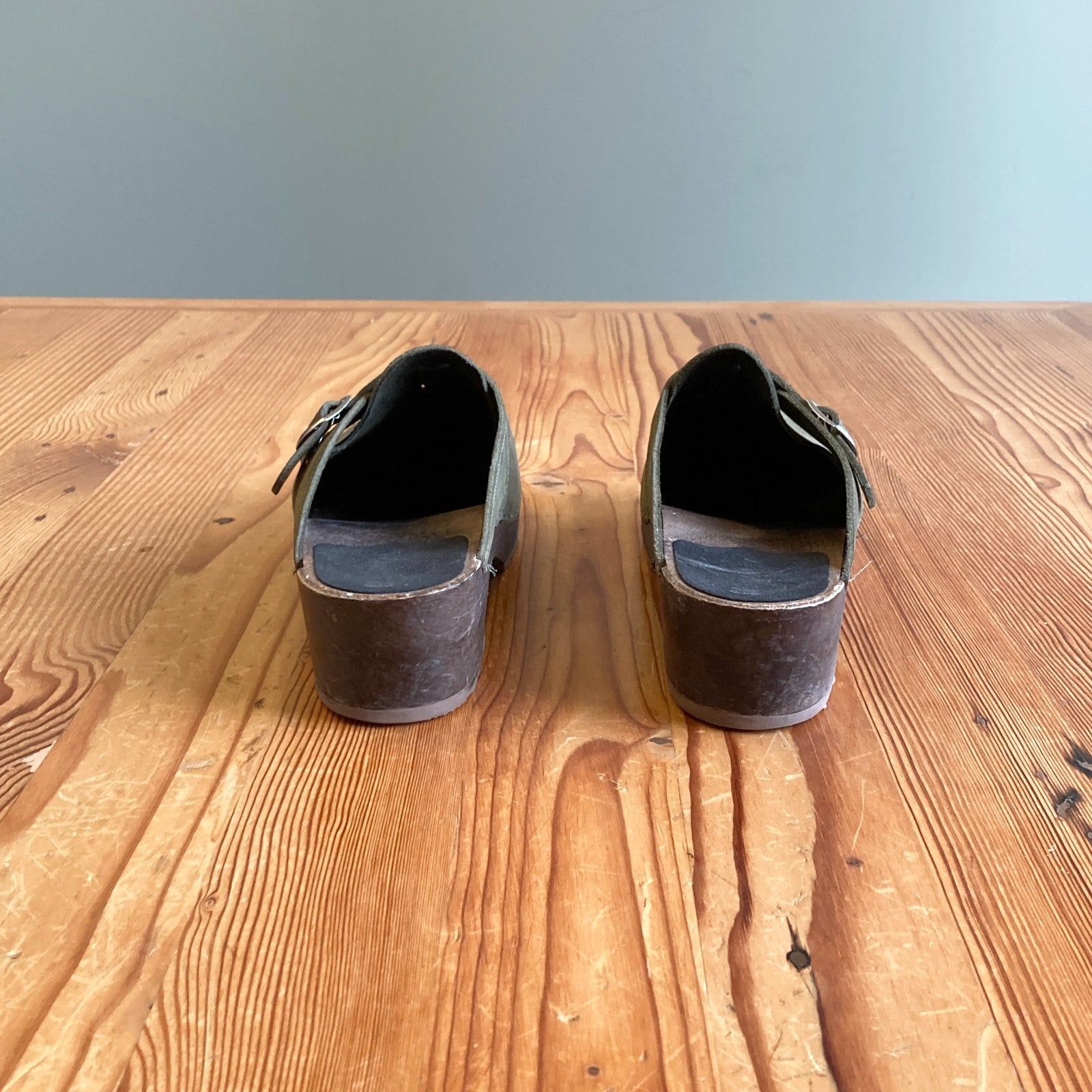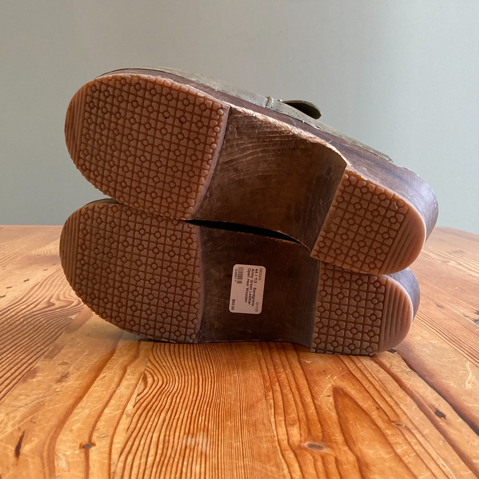 44 / 11.5 - Sandgrens Army Green Leather Open Heel Wooden Clogs Shoes 0603AG
