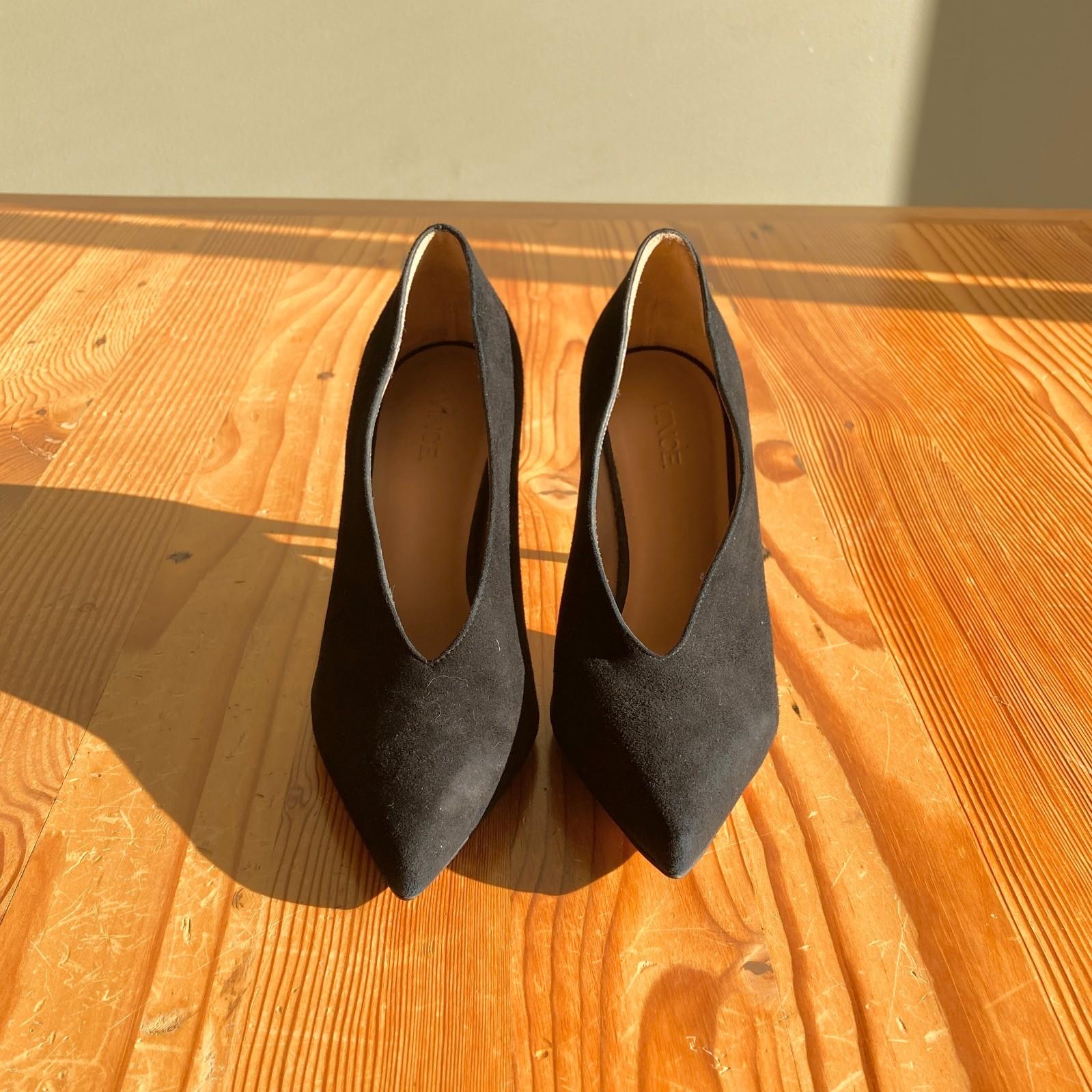 - Luxe suede point toe pump with high-cut topline Made in Italy Designer