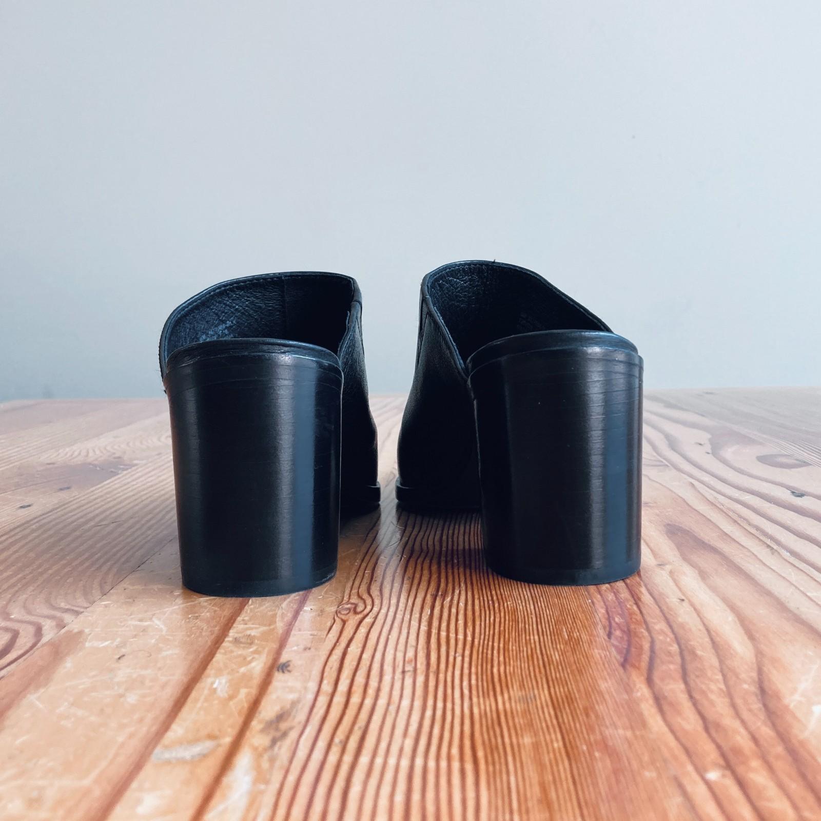 6 - Frye Black Leather Flynn Pointed Toe Stacked Heel Mules Shoes w/ Box 0103SA
