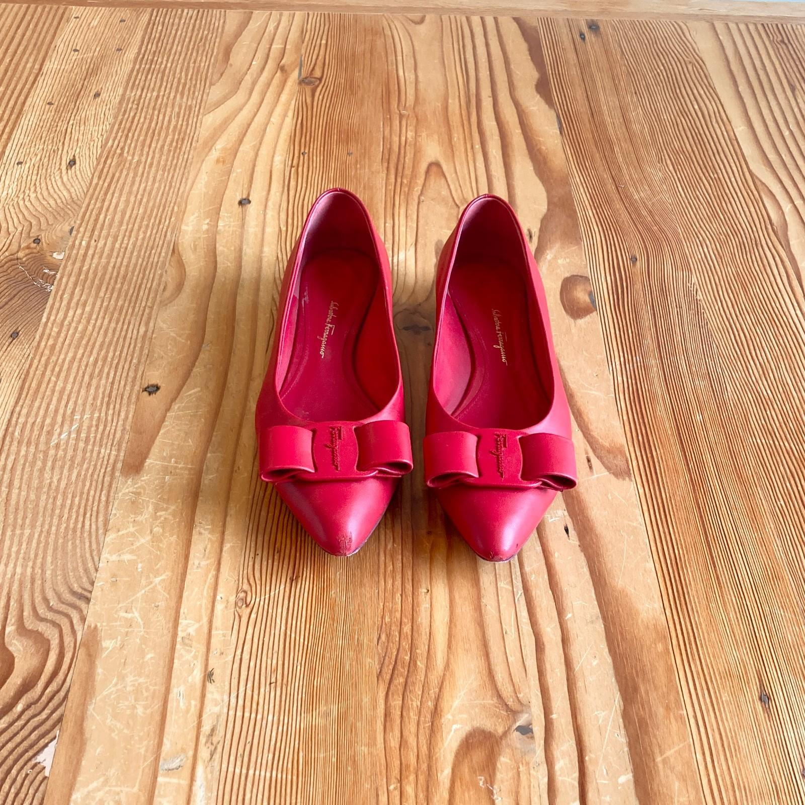 8.5 - Ferragamo Red Leather Bow Toe Viva Flats Shoes w/ Box *skuffed toe 0419NR