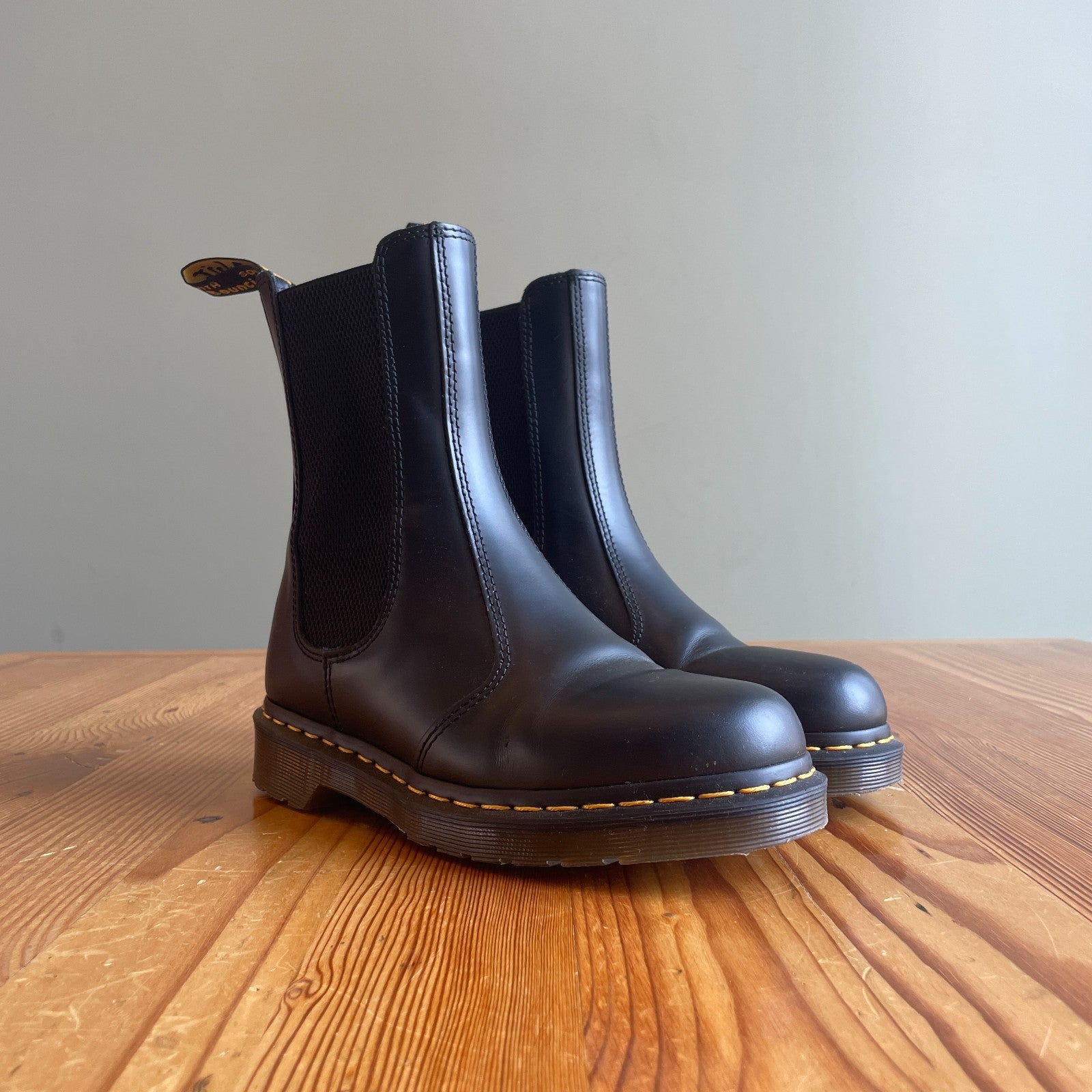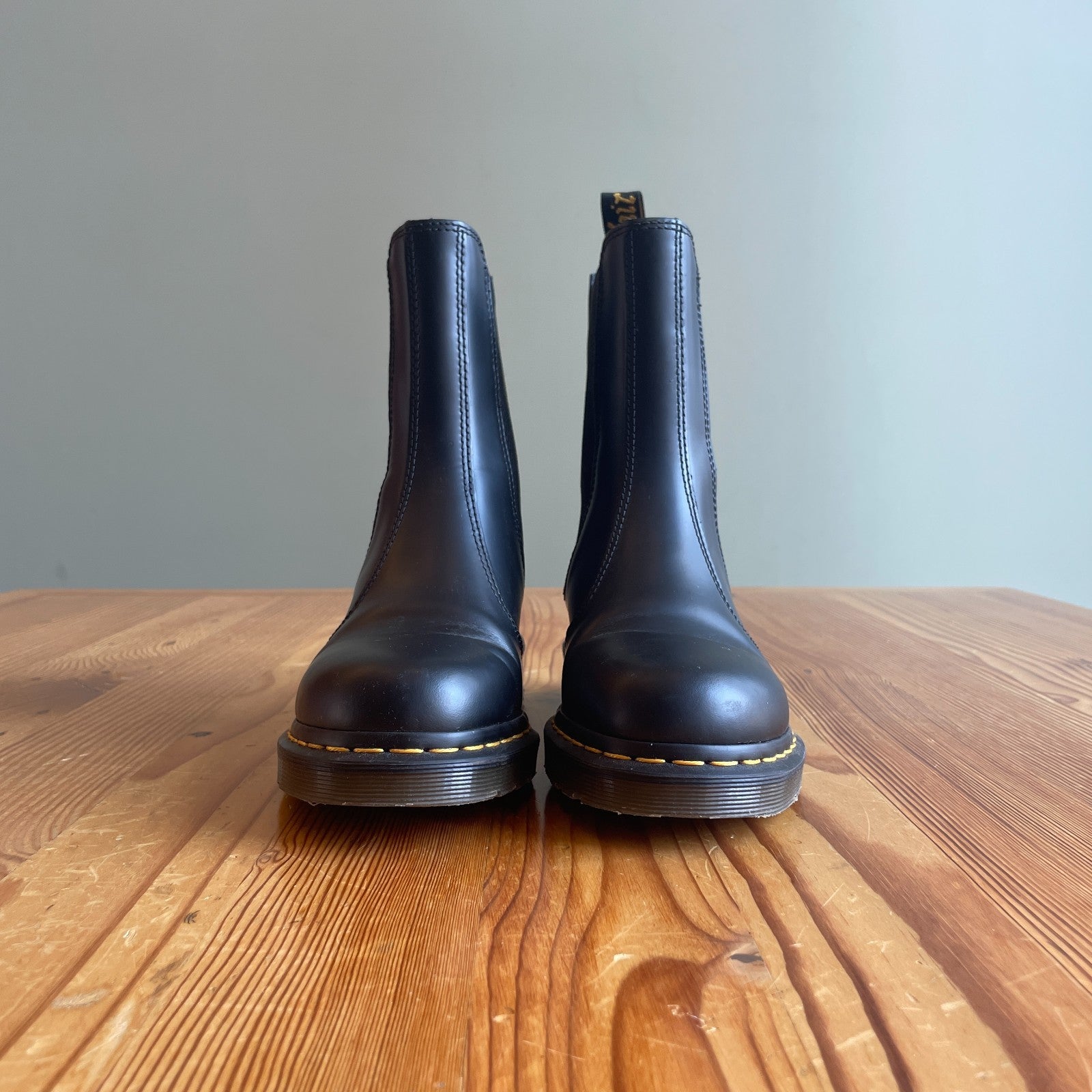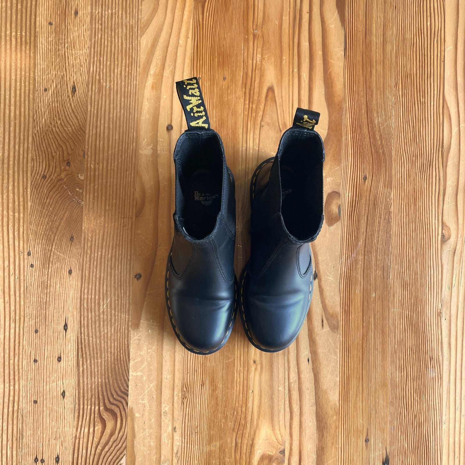 - Made from tough Smooth leather, the Chelsea boots stay true to the decades-old design with yellow welt stitching and a scripted AirWair heel loop.