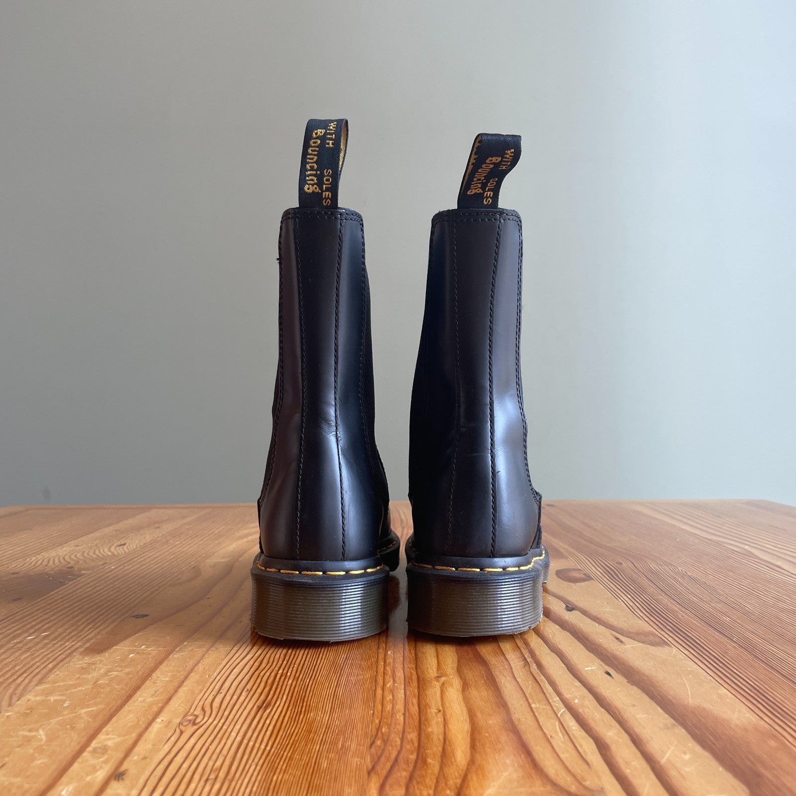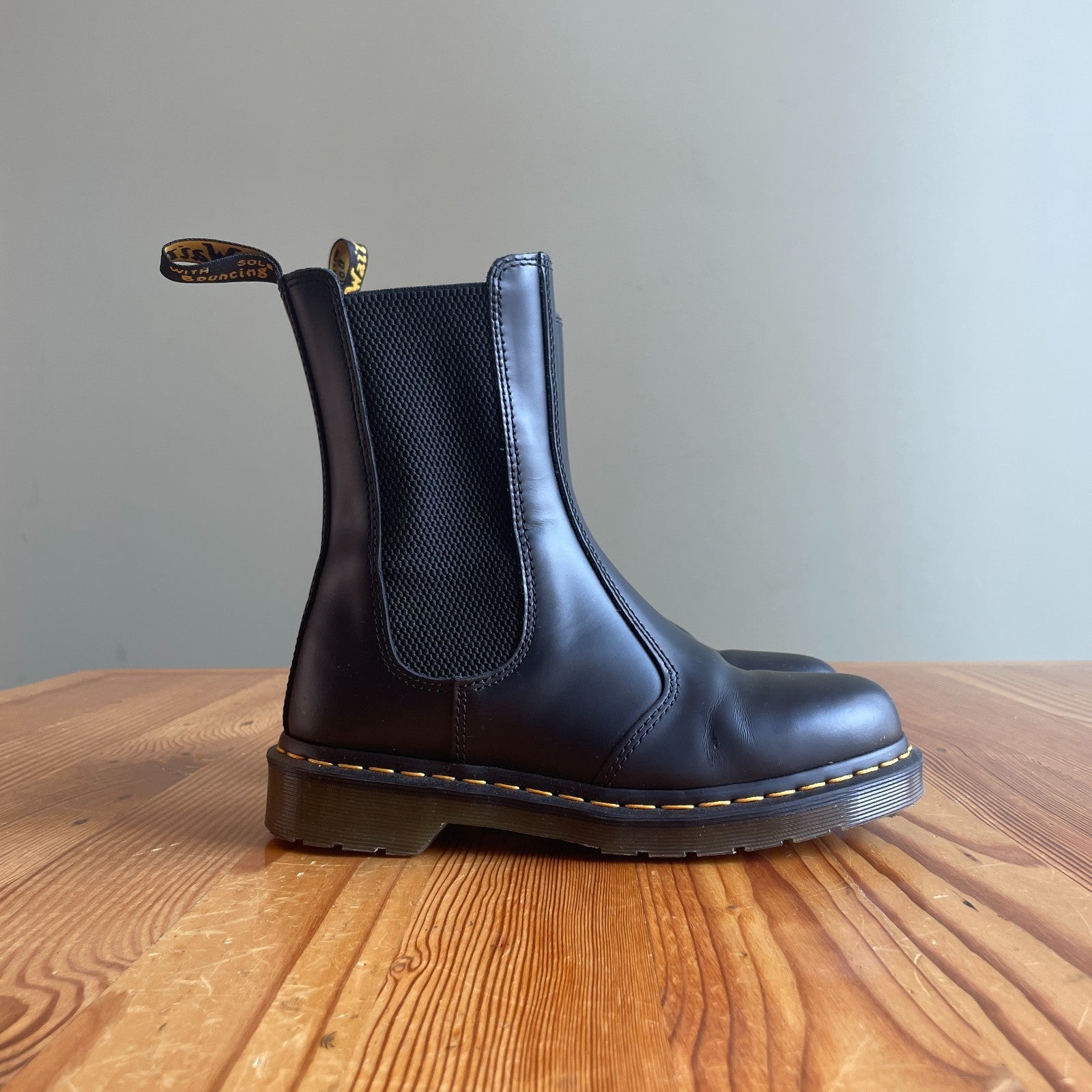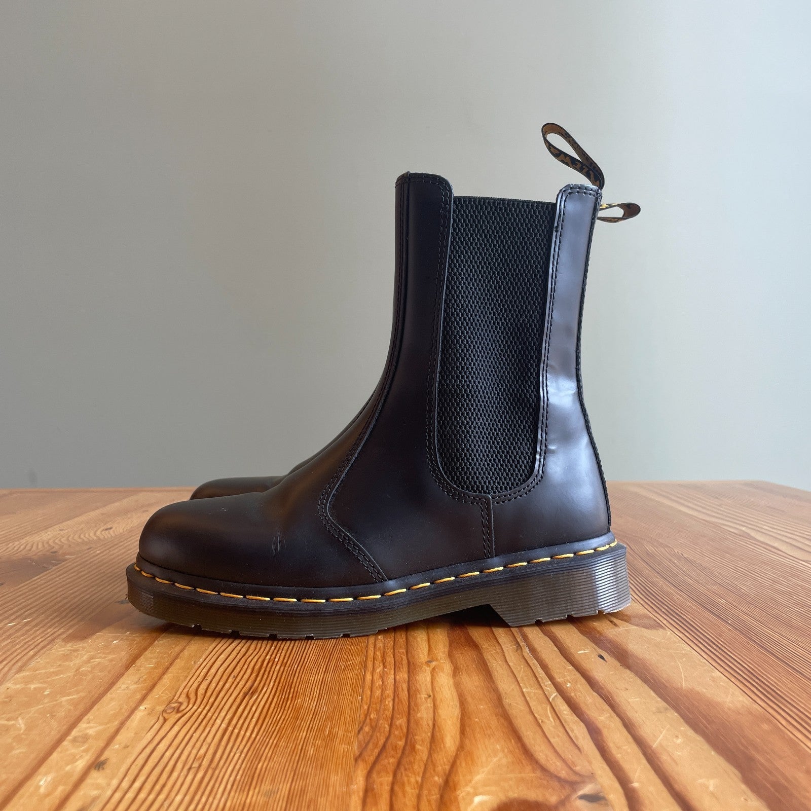 - Made from tough Smooth leather, the Chelsea boots stay true to the decades-old design with yellow welt stitching and a scripted AirWair heel loop.