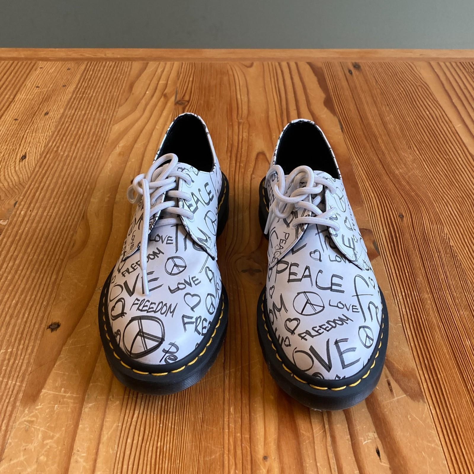 9 - Dr. Martens White Leather Peace Love Script 1461 Lace Up Shoes NEW 1019HV