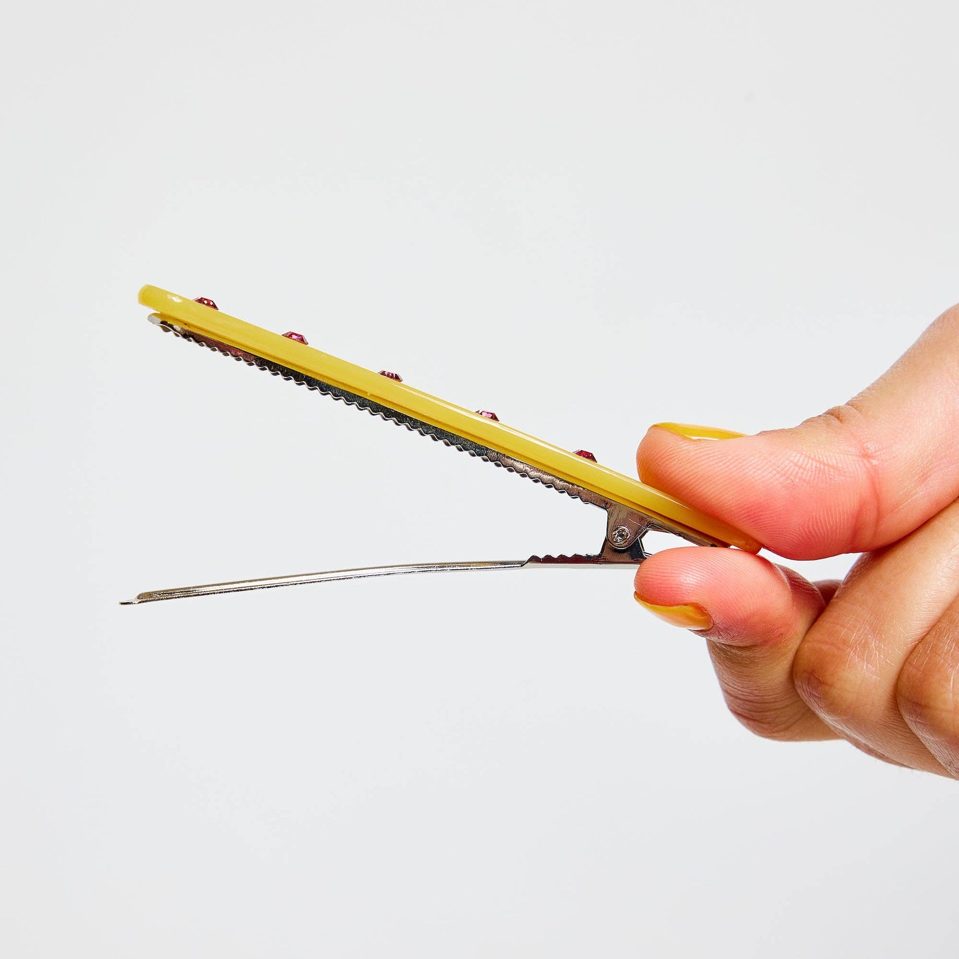 A large, single alligator style clip, accented with rhinestones. Small metal teeth provide a strong hold with no snag. Ideal for all hair types and lengths. Great for keeping your hair neatly tucked away.