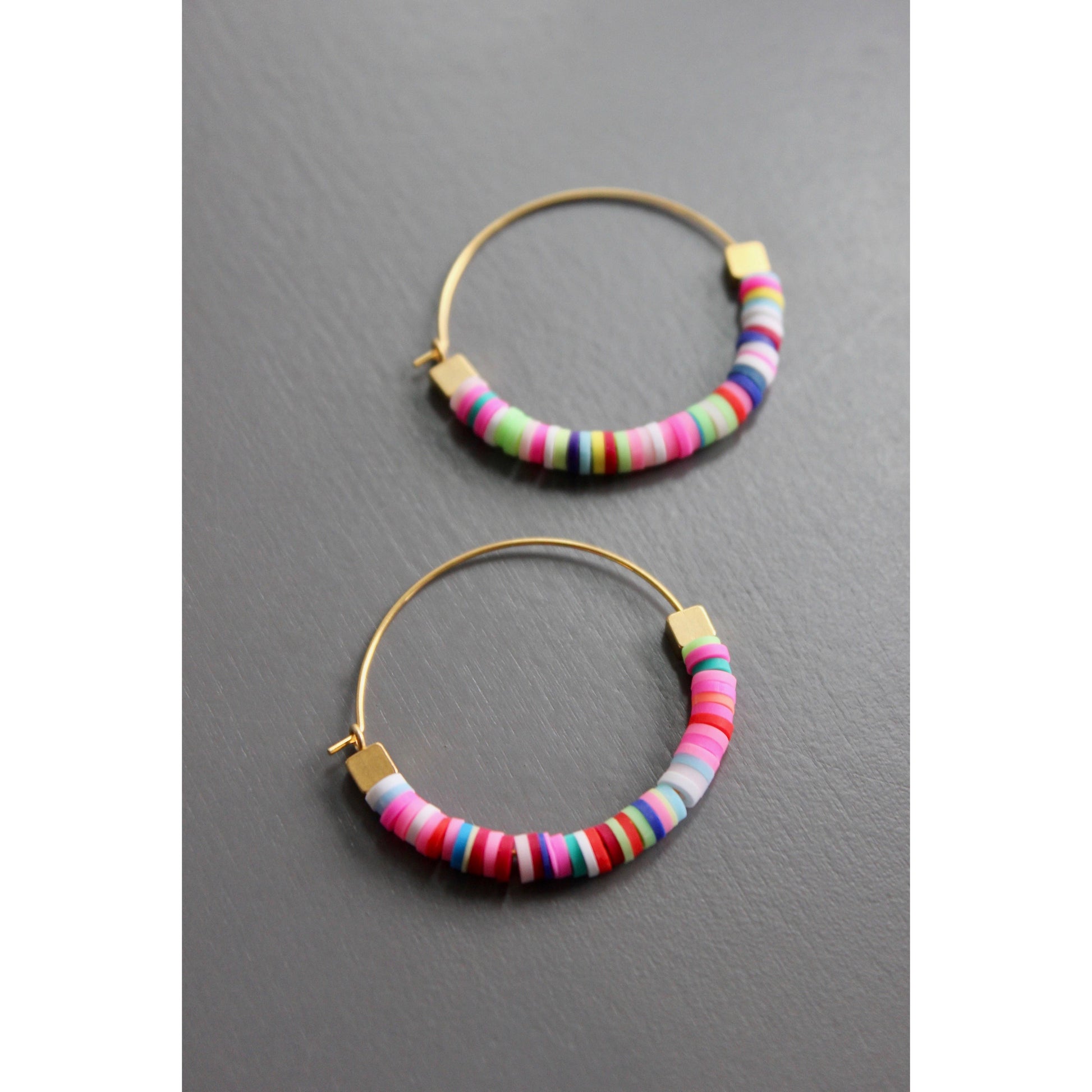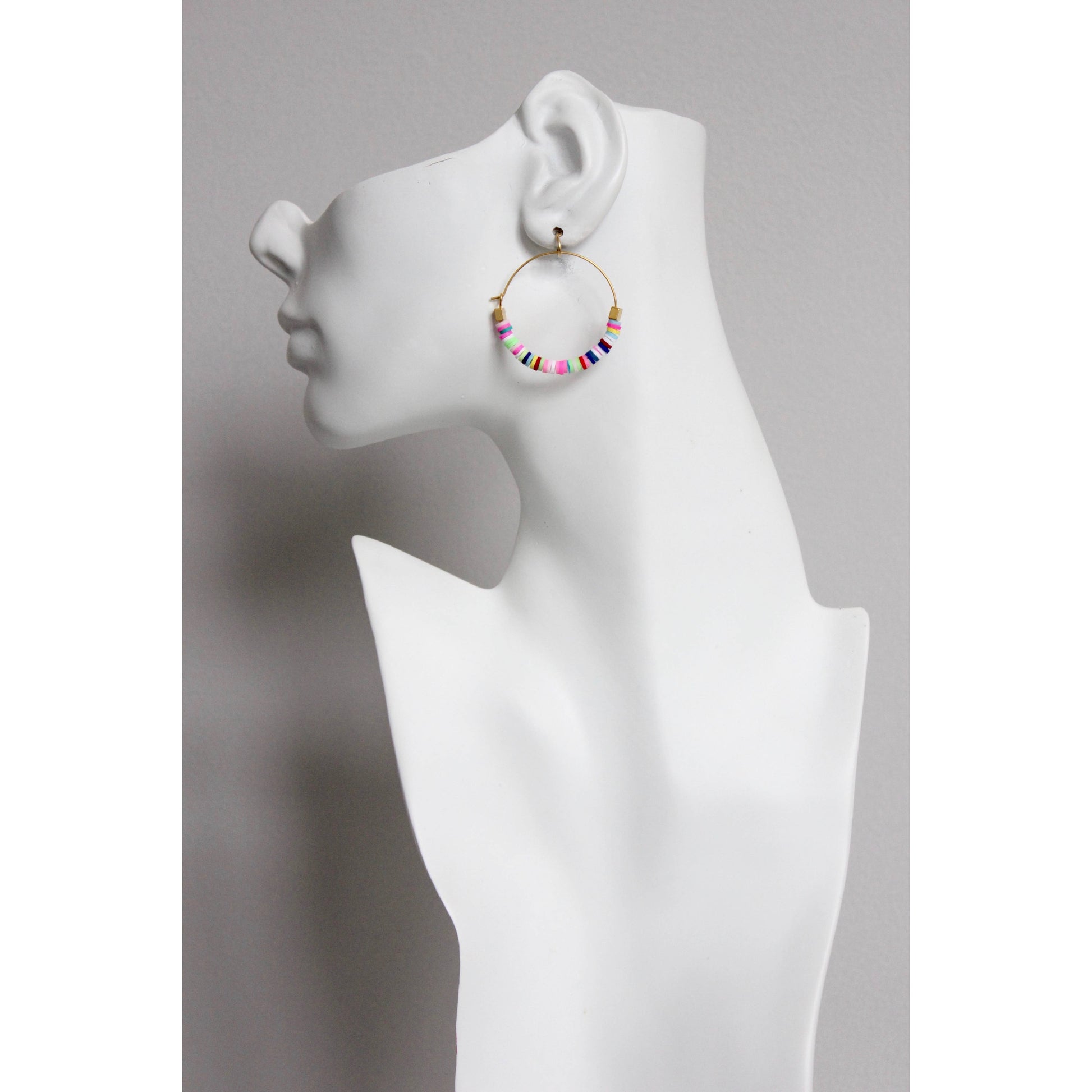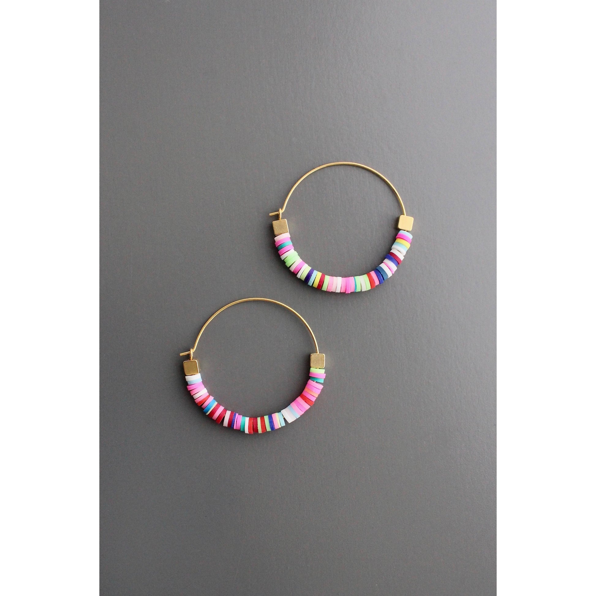 18k gold plated brass hoop earrings with polymer clay. Each pair weighs .11 oz. and measures 1.5 inches long.
