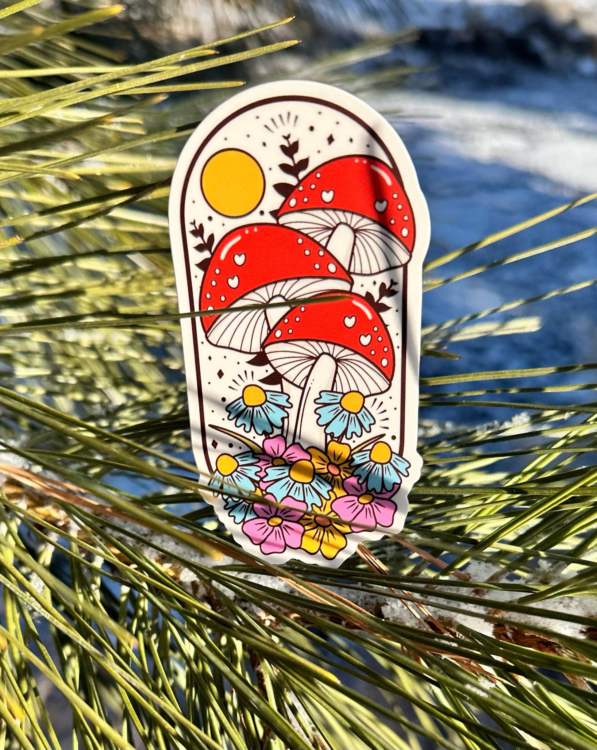 Accessorize your next trip with our Wild Mushrooms design! Featuring lovely Amanita mushrooms and colorful wildflowers, this vibrant superbloom looks great on all sorts of your favorite gear! Durable vinyl material protects your sticker from scratches, water, or sunlight, making it a funky addition to everything from skateboards to water bottles. A fantastic gift for fungi hunters and bohemian types.