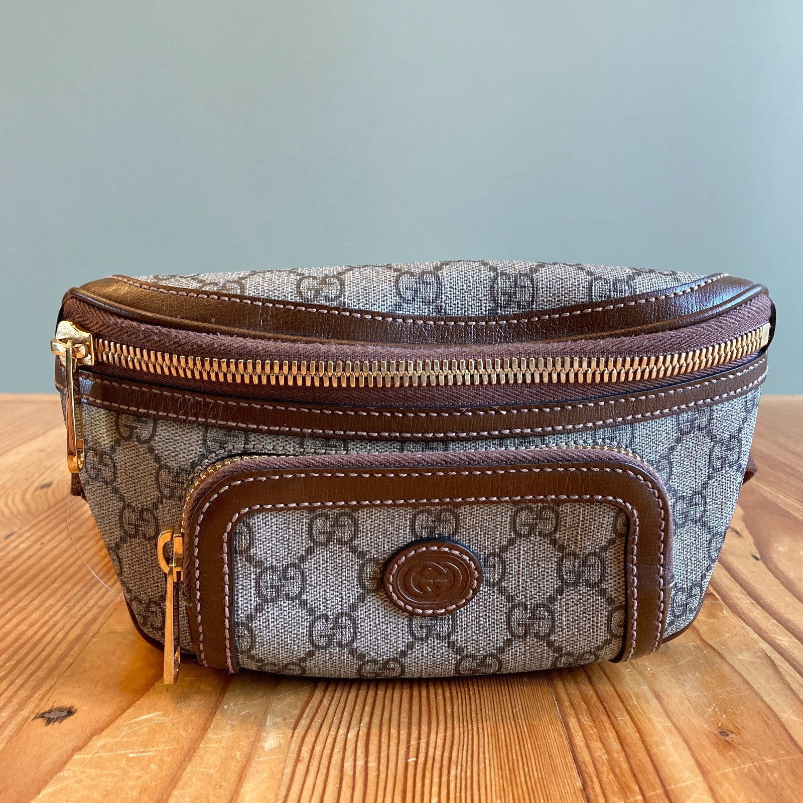 - A compact and practical belt bag crafted in GG Supreme canvas with beige and brown tones. Features the iconic interlocking G logo at the front and an adjustable strap for hands-free carry. Great for daily errands or travel.