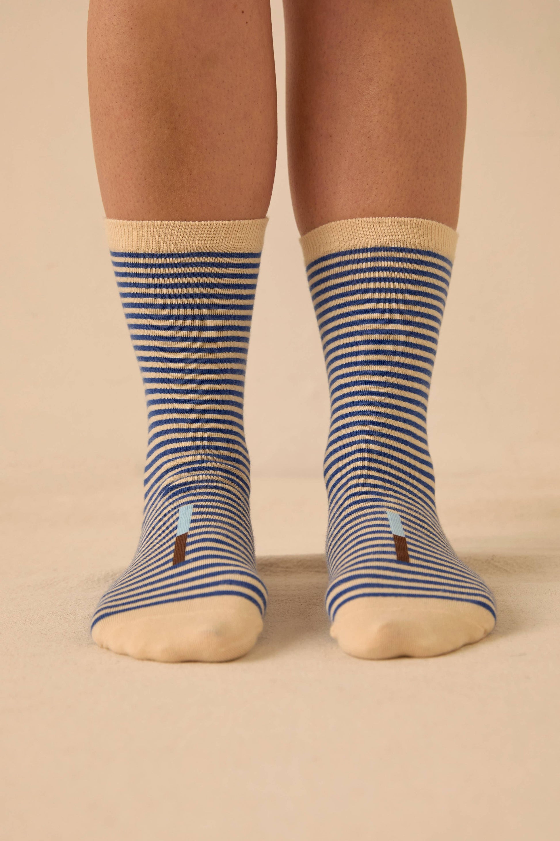 Striped crew socks in blue with our signature color bar detail. Lightweight, comfy, and unisex.