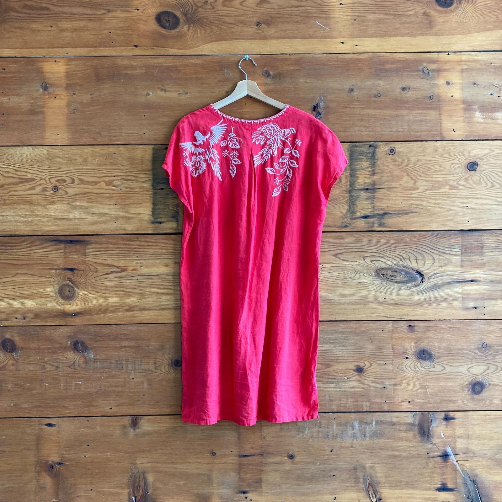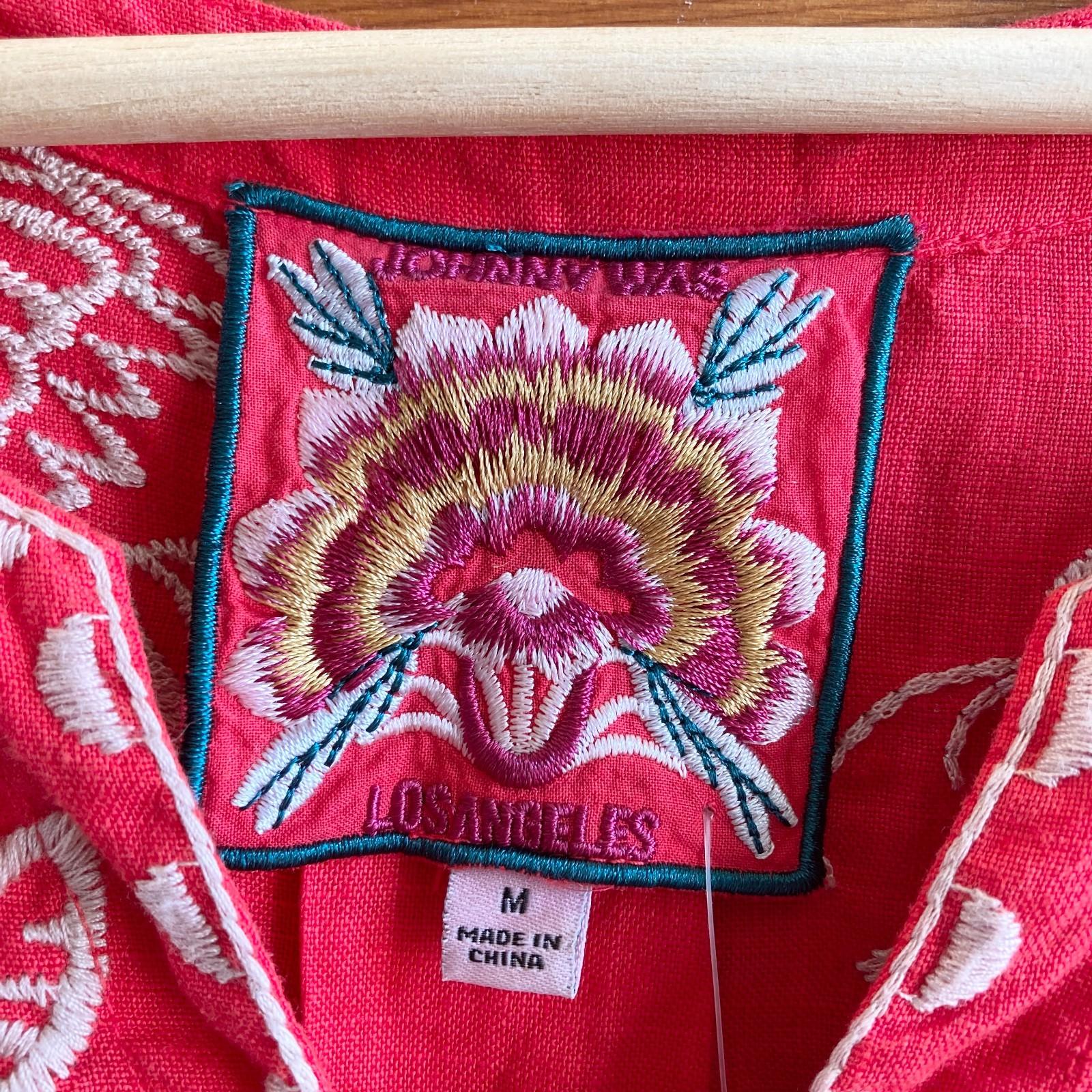 M - Johnny Was Red Linen Floral Embroidered Abigail Short Sleeve Dress 1011DK