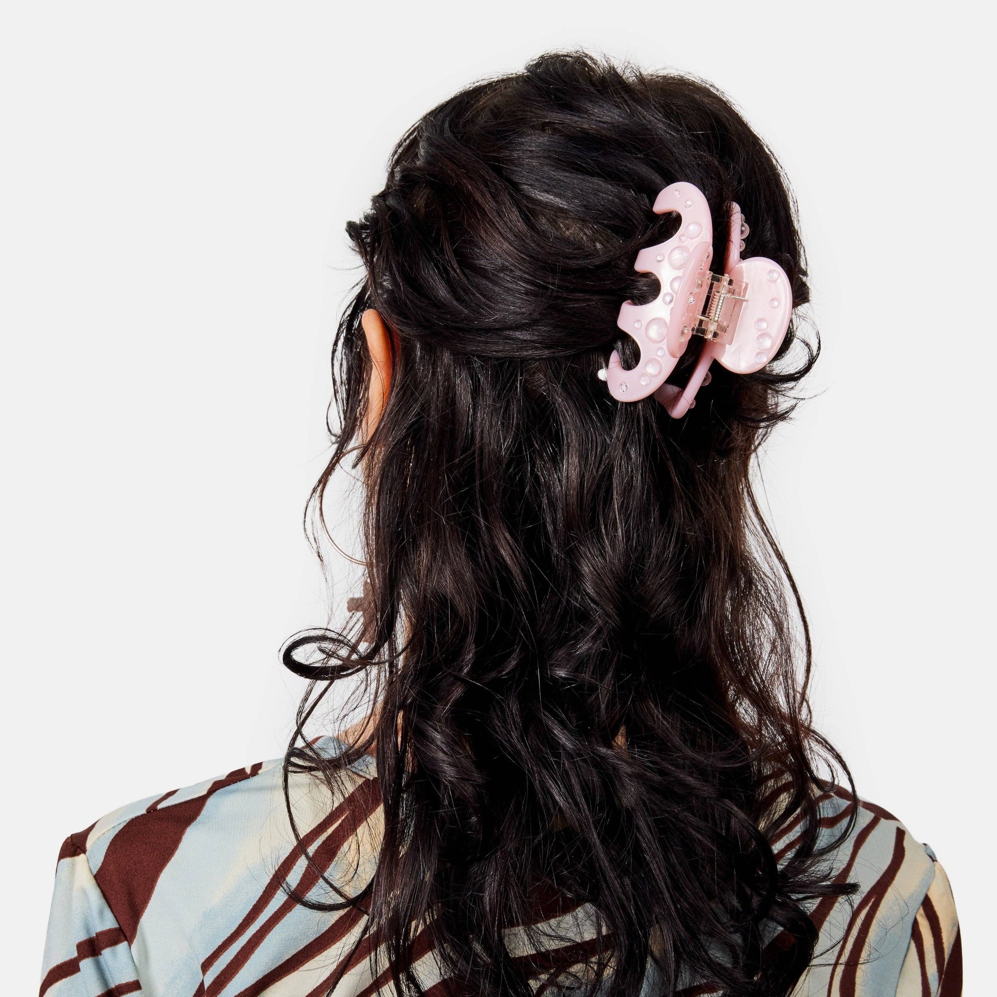 A medium sized hair claw with interlocking teeth that provide a secure hold for thin to medium hair types and most hair textures.
