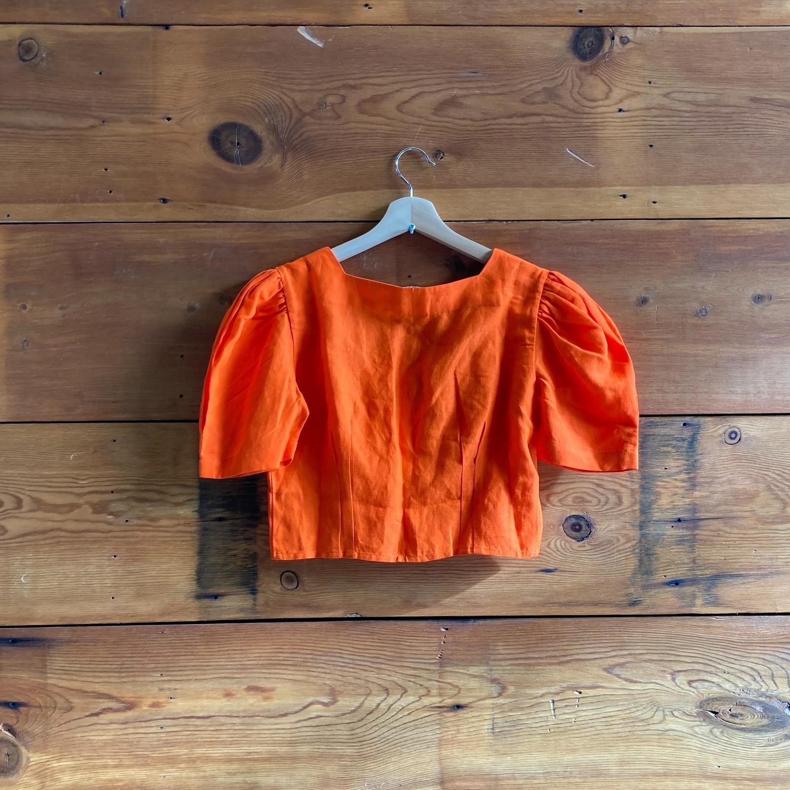 S - Hannah Kristina Metz Red Copped Puff Short Sleeve Linen Crop Top 0723ML