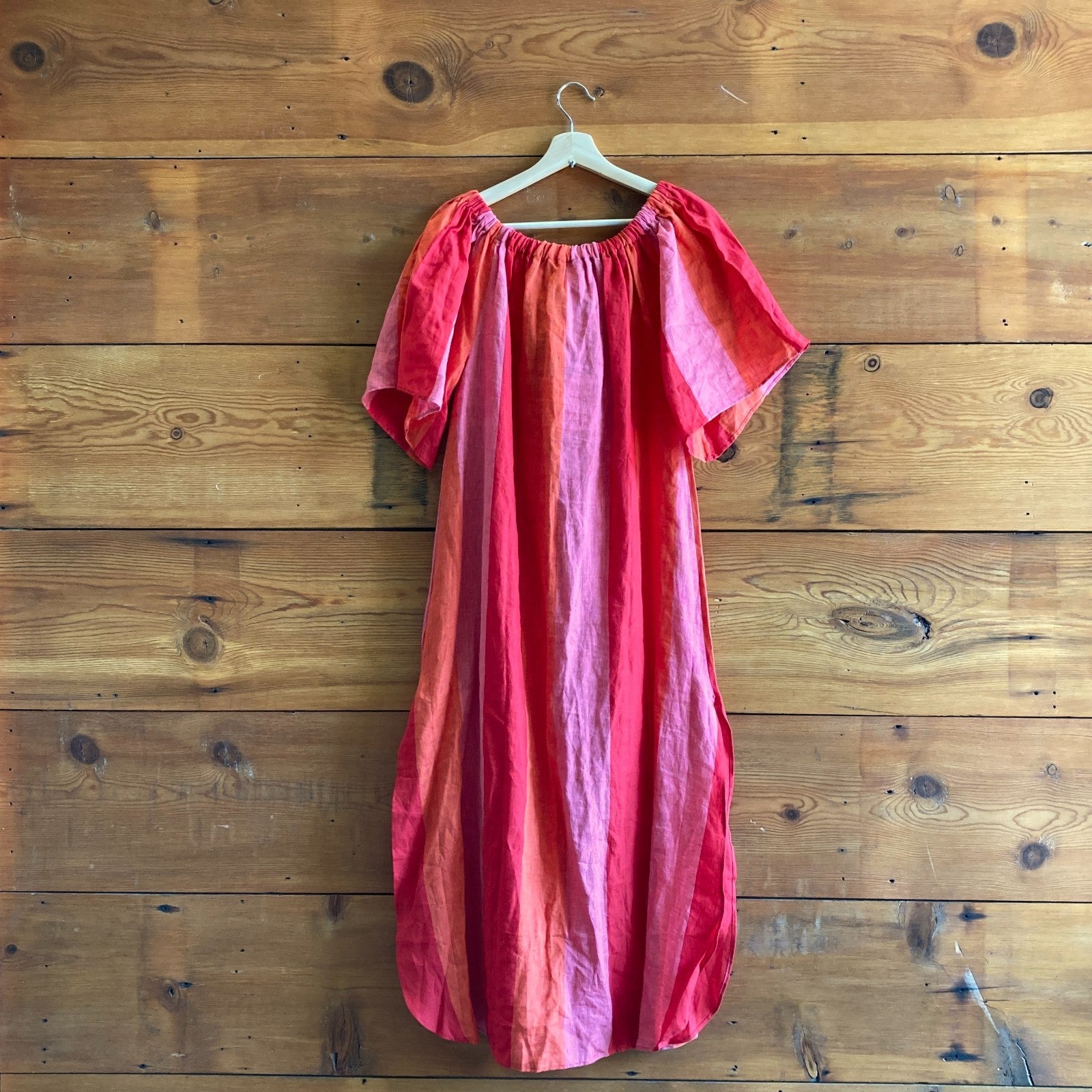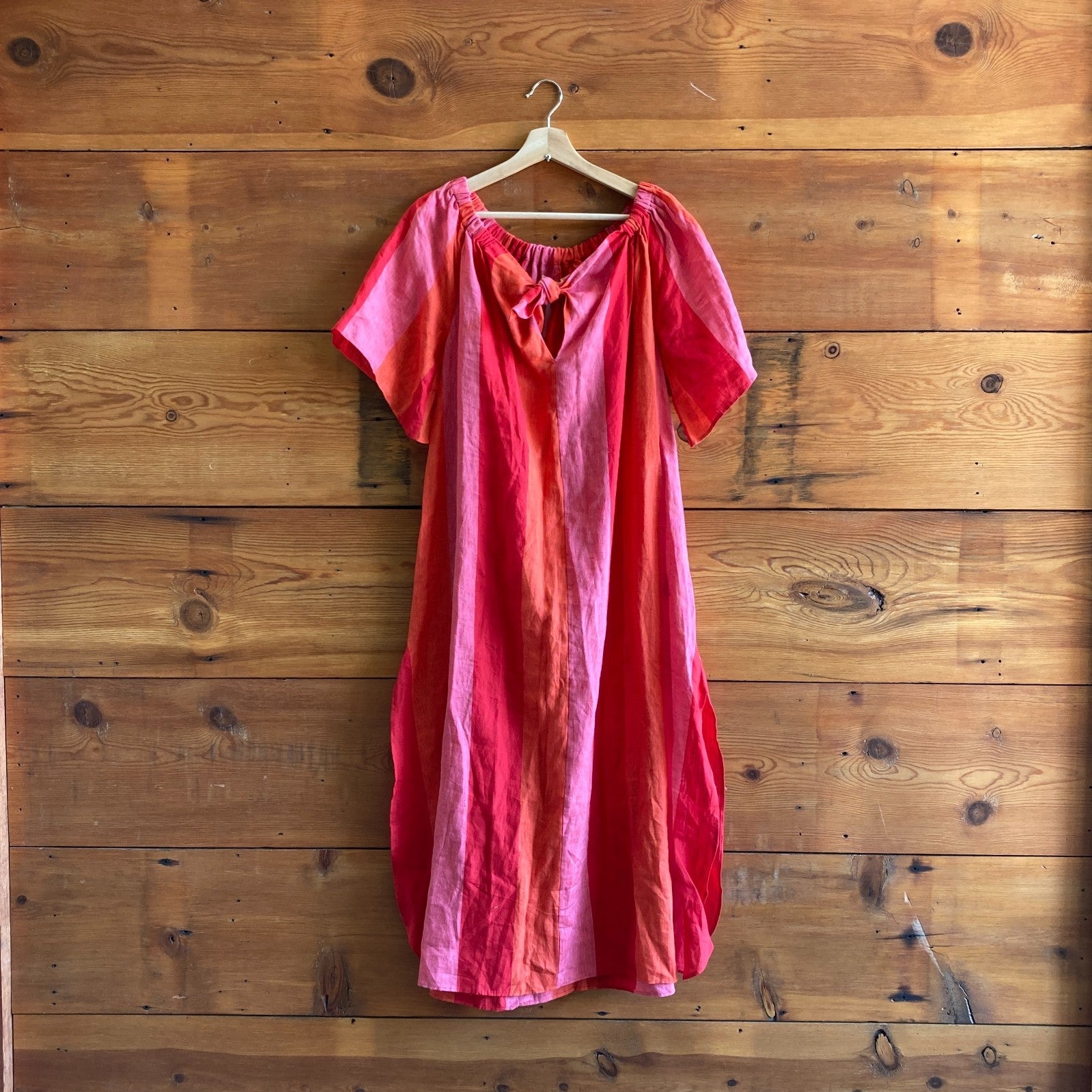 - Mara Hoffman vertical striped dress in linen with bow detail at top. Off-the-shoulder neckline. Half sleeves. Bow front with keyhole. Loose, relaxed silhouette. Hem falls below the knee. Side split hem. Pullover style. Linen. Machine wash. Made in Portugal. Model is 5'10"/177cm and wearing size S.
