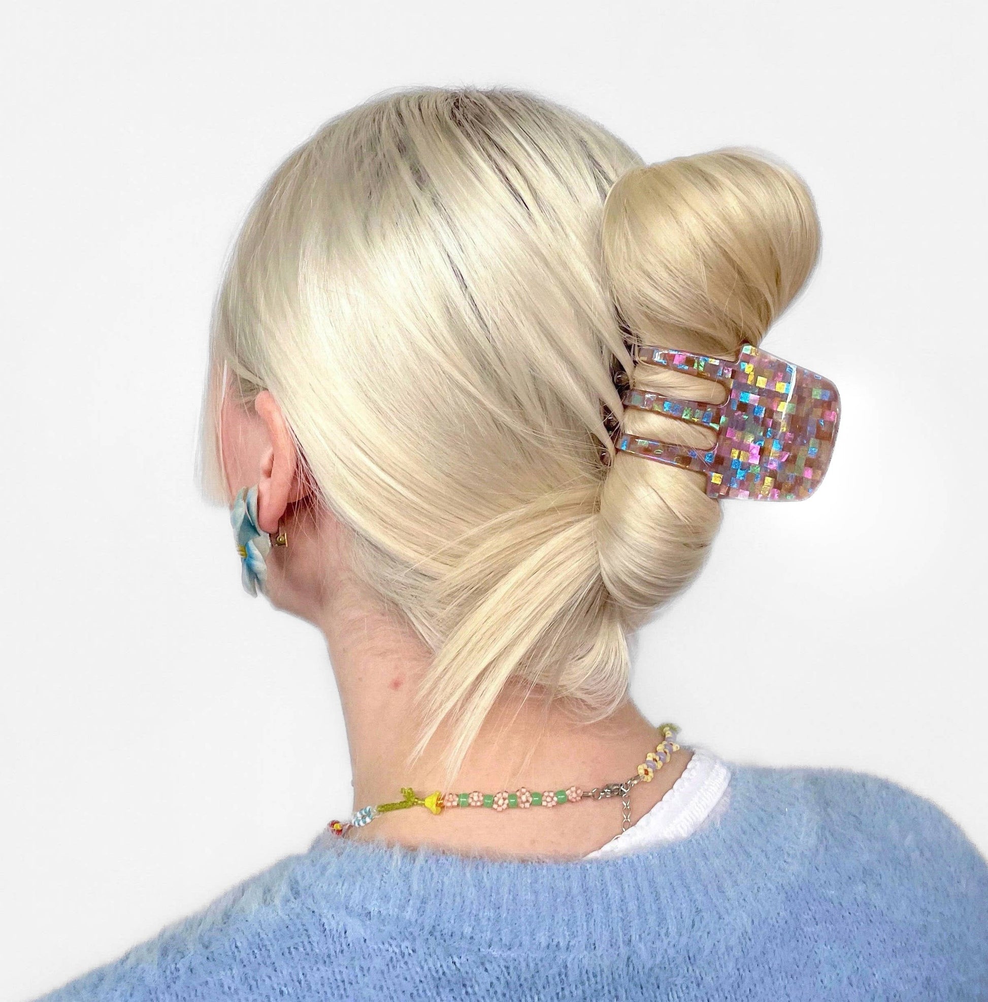 This medium sized claw is uniquely perfect for curly, textured, medium to thick hair. Large teeth give a gentle but firm hold, without crushing curls.