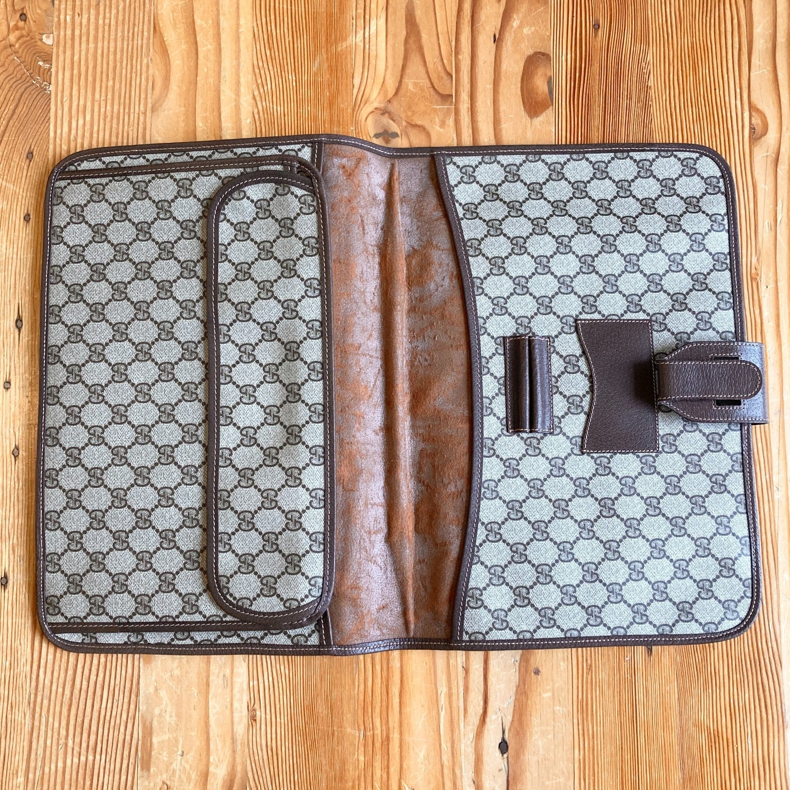 - In excellent exterior, good interior condition. Feature leather latch closure main compartment, 2 sleeve pockets, a flap closure pocket, 2 pen holders, and a card sleeve pocket.