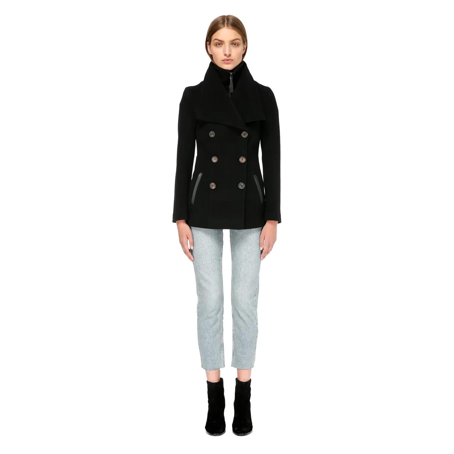 - NORISSA by MACKAGE is a hip length, wool peacoat in a tailored silhouette. Features a double collar with a removable inner bib for extra warmth, adding essential warmth to an outerwear classic. Double-breasted button closure. Zip pockets with leather trim at front. Black nickel hardware. Available in black.