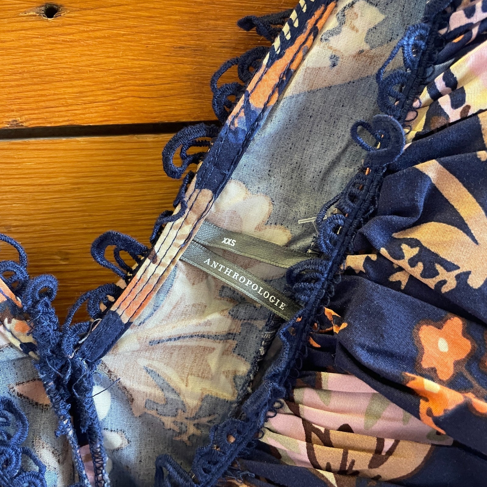 - Navy blue dress with pink, orange and brown floral print